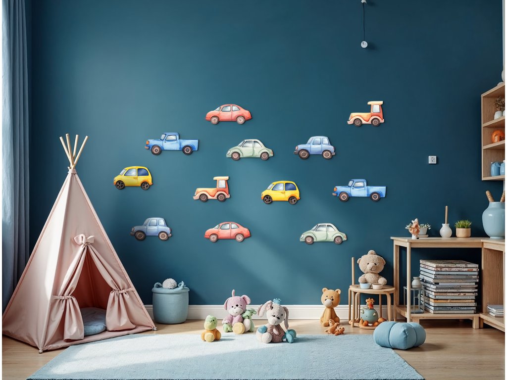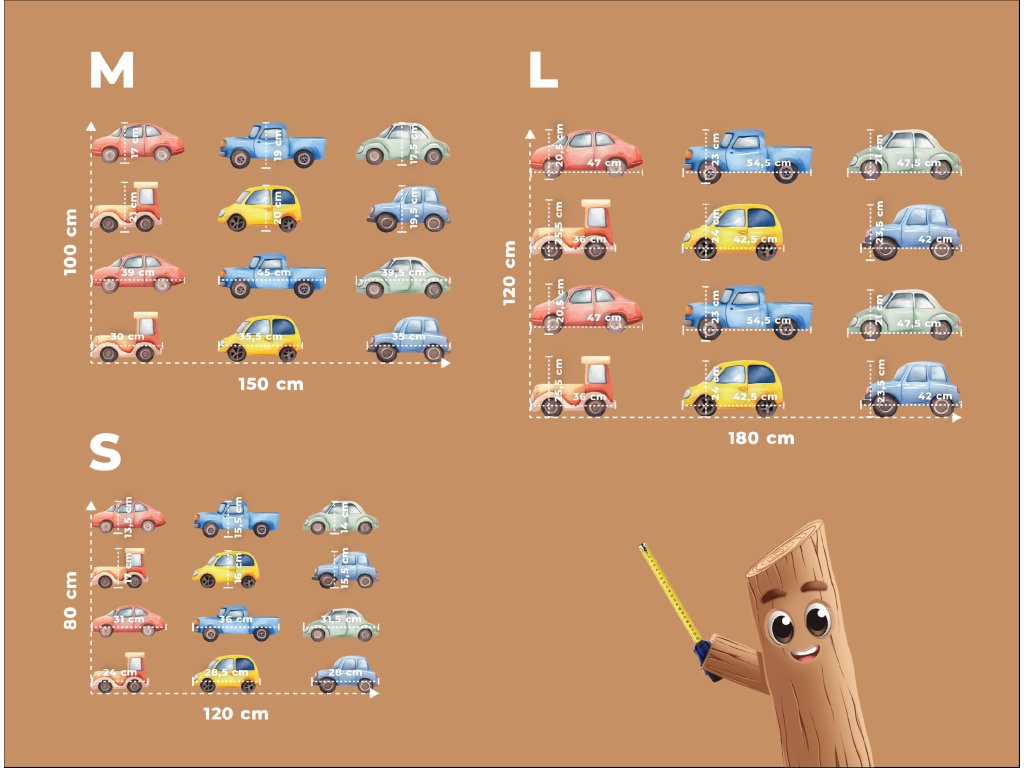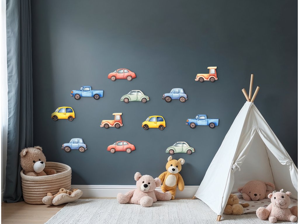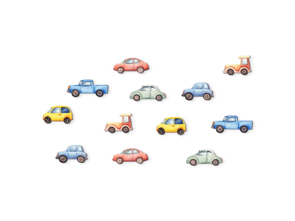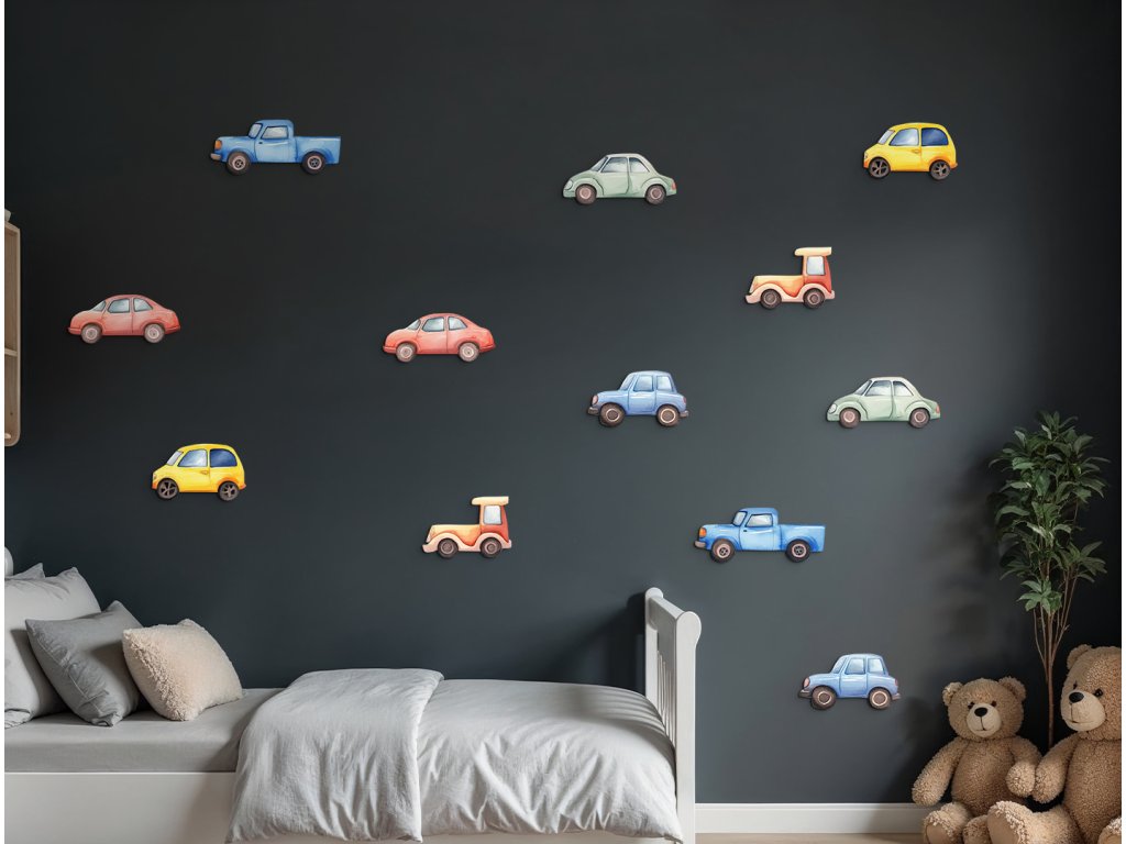 Sada 12 kreslených autíček v různých tvarech a pestrých barvách, které vnesou do pokoje hravost a energii. Každé autíčko má svůj jedinečný design, což podporuje dětskou zvědavost a rozlišovací dovednosti. Skvělý doplněk pro malé milovníky aut a dopravního světa.