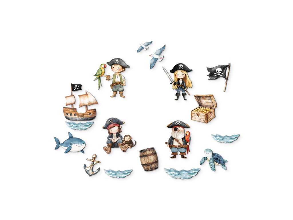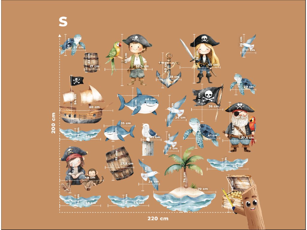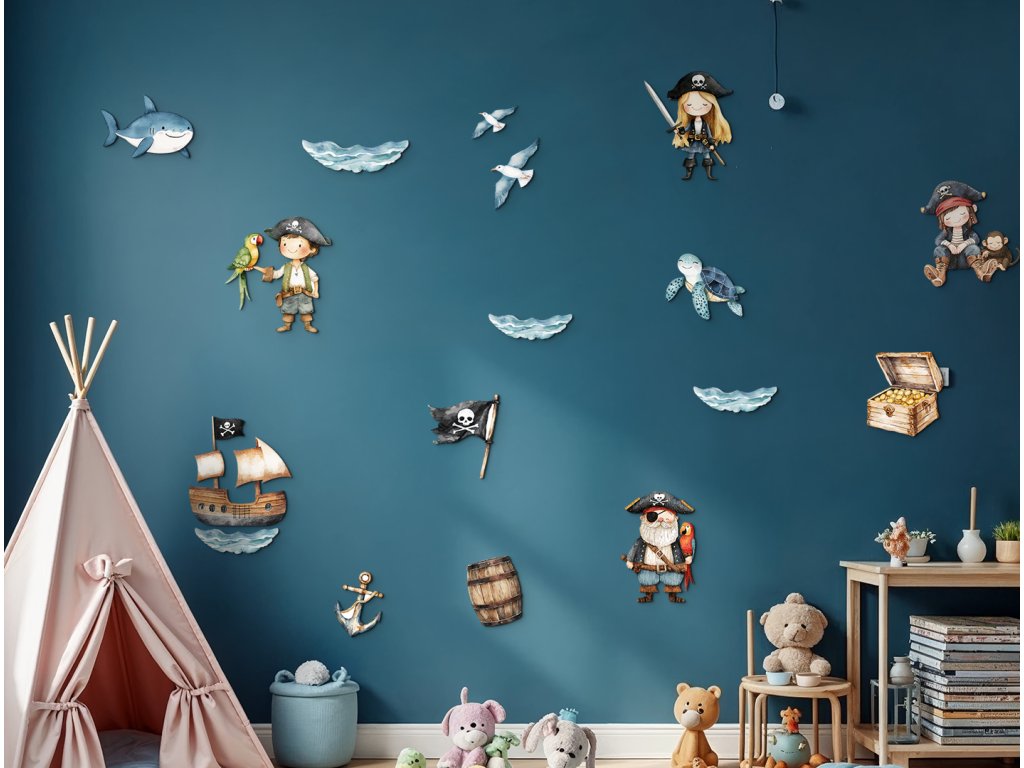 Hravě ilustrovaná dekorace plná dobrodružství, kde čtyři dětští piráti objevují oceánský svět. Kolem jejich lodi plují velryby, rybky a další mořské tvory, které spolu vytvářejí veselou a barevnou scénu. Skvělý doplněk do dětského pokoje pro malé dobrodruhy.