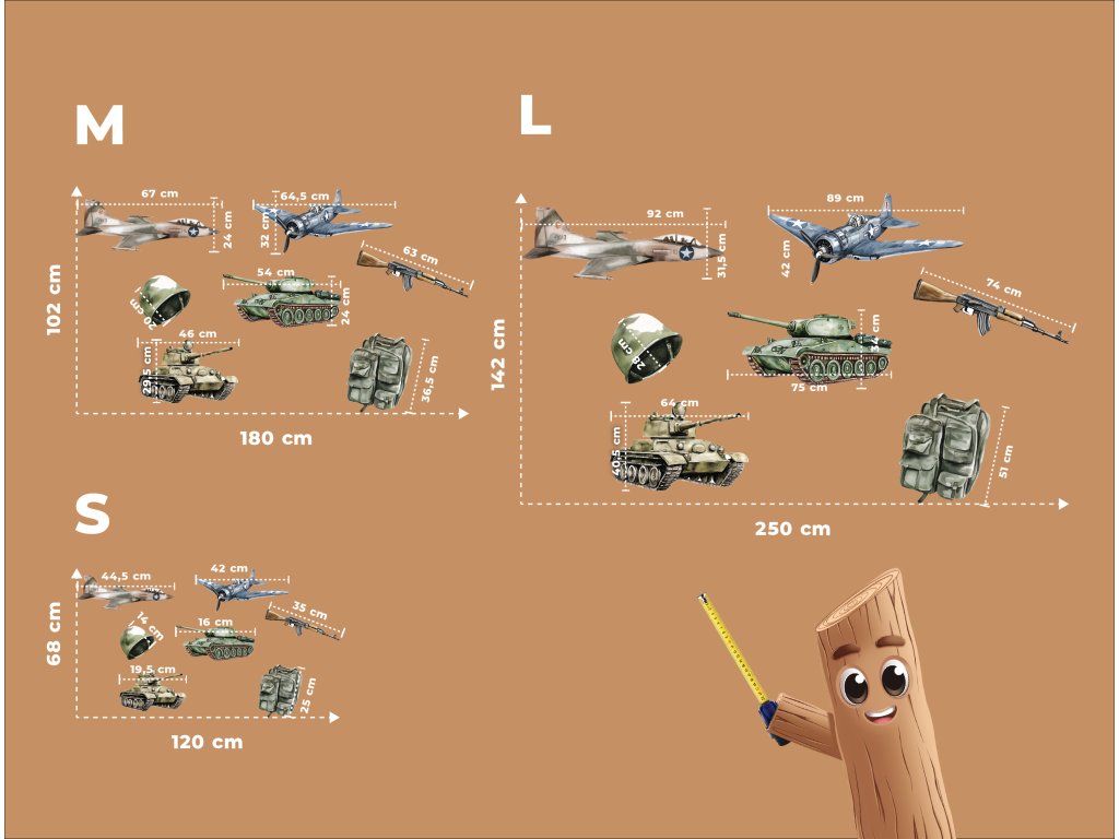 Tato sada dětských ilustrací zobrazuje stíhačky, tanky, přilbu a výbavu v hravém, kresleném stylu. Vojenská technika je zde zpracována jemně, s důrazem na dětskou představivost, ne na boj. Ideální doplněk do pokoje malého fanouška letadel, strojů a dobrodružství.