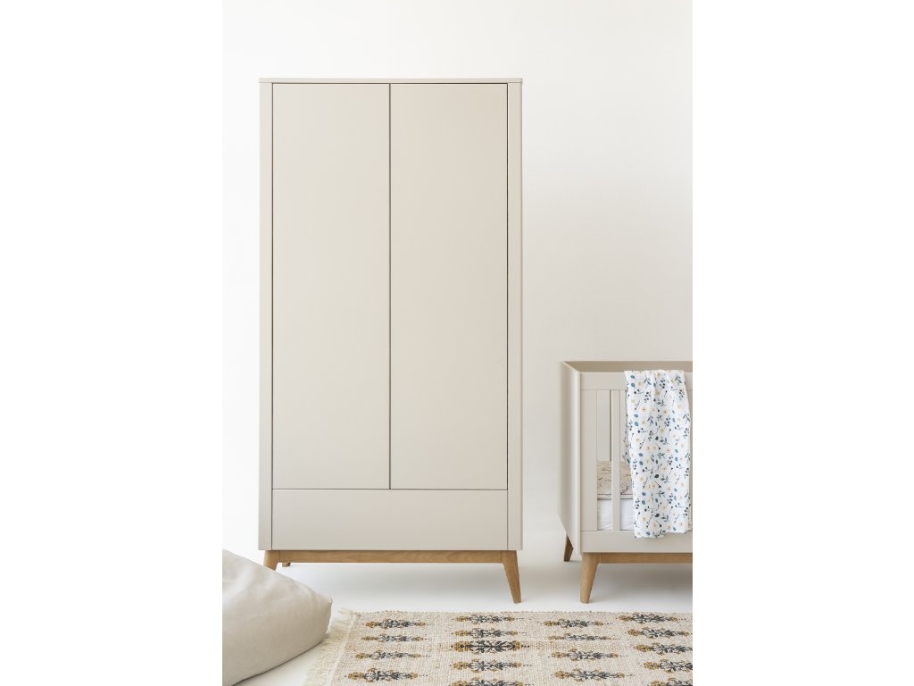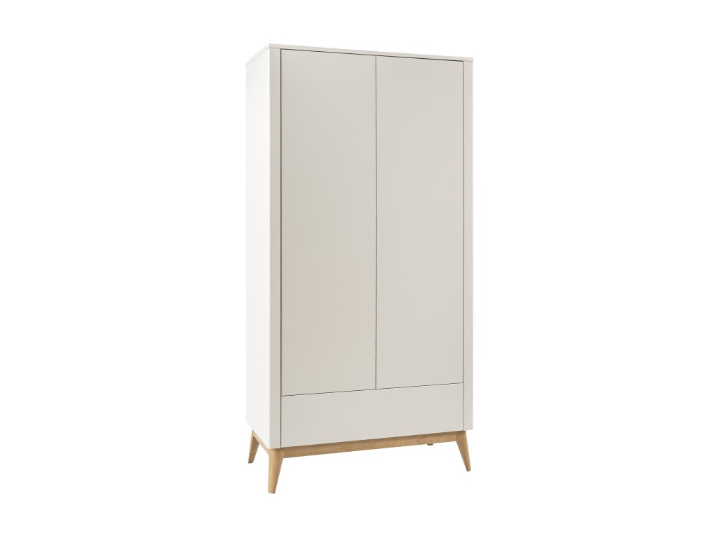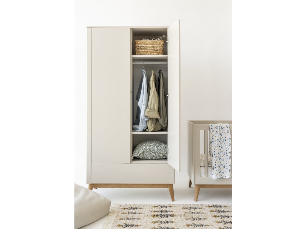 Dvoudveřová skříň z kolekce Seth je elegantním a praktickým řešením pro úhledné uložení oblečení a dětských doplňků. Prostorná zásuvka a vnitřní prostor kombinuje police a šatní tyč, takže nabízí flexibilní využití dle potřeb dítěte.