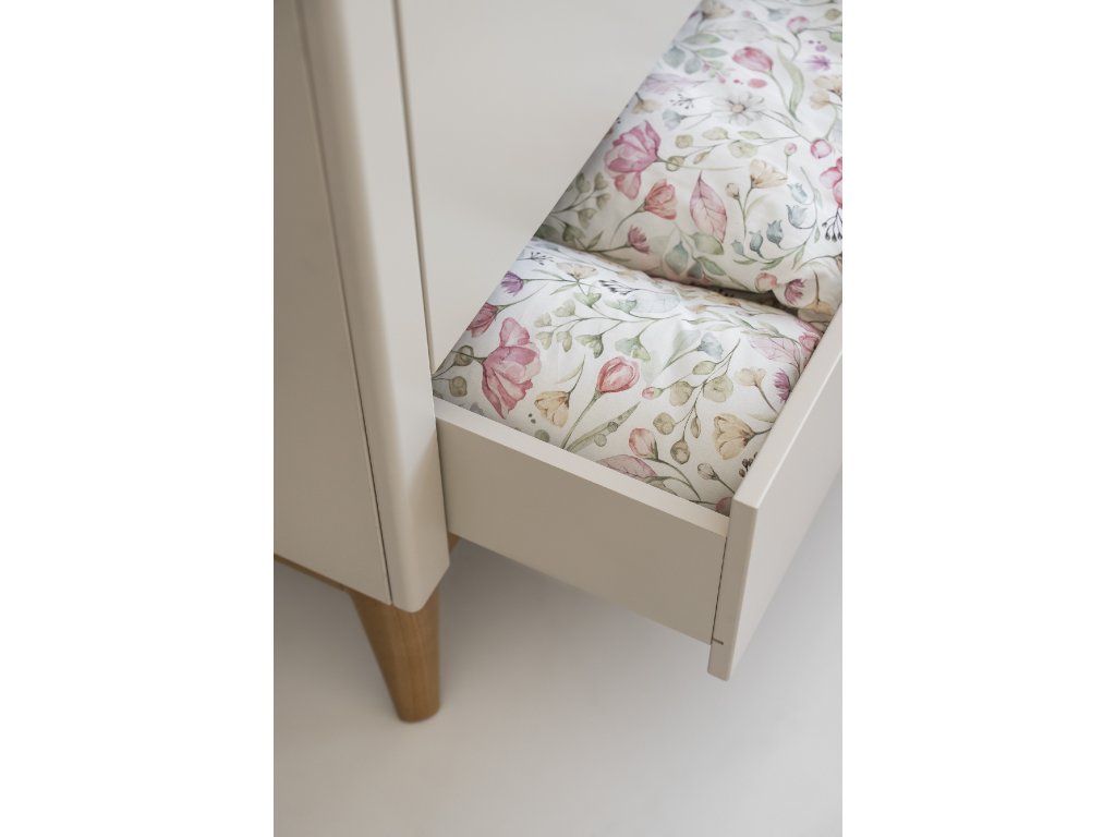 Jemná kombinace béžové barvy (champagne) a přírodního bukového dřeva působí nadčasově a neutrálně, díky čemuž se hodí do dívčího i chlapeckého pokoje. Systém tichého dovírání dvířek zaručuje pohodlné a bezpečné používání každý den.