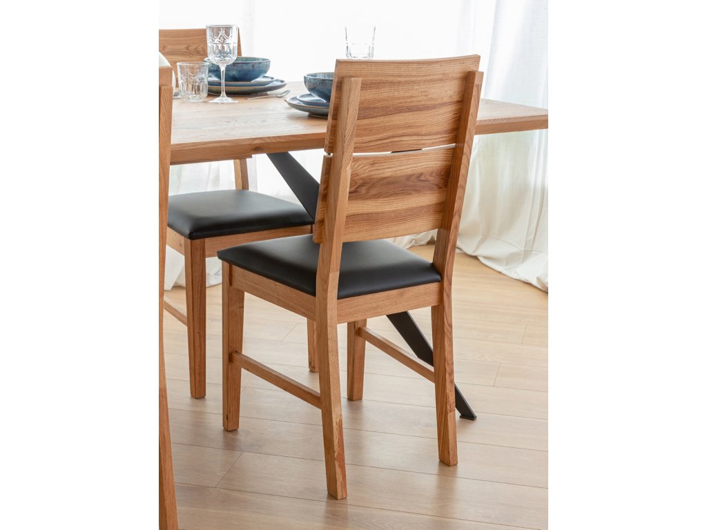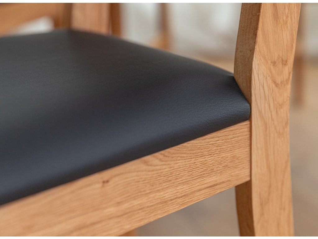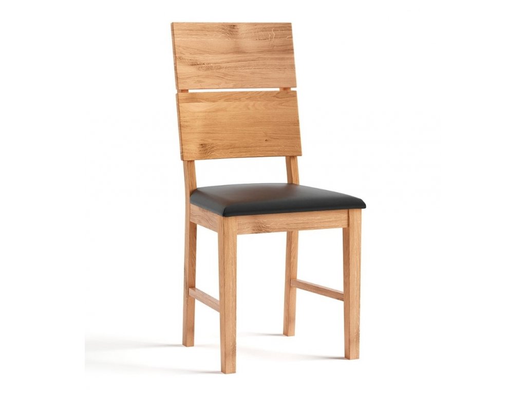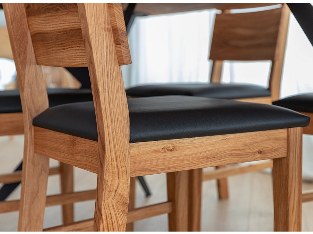 Dubová židle z přírodního dřeva je vybavena pohodlným sezením - čalouněnou pěnou pokrytou černou ekokůží. Dubová židle má široké, pevné opěradlo, které poskytuje pohodlnou oporu páteři. Dubové dřevo je mimořádně trvanlivé. Díky jeho tvrdosti jej můžete používat roky beze stopy opotřebování.