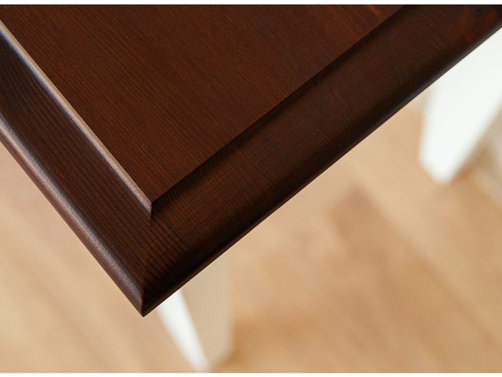 Přírodní materiál finská borovice má vliv nejen na jemný vzhled, ale také na kvalitu výrobku. Borovicový stůl je velmi odolný a jeho pevné nohy mu dodávají mimořádnou pevnost. Navzdory tomu, že povrch dřeva byl pokryt bílou barvou na vodní bázi (85% krytí), prstence ve dřevě jsou stále patrné. To je asi největší výhoda nábytku z přírodního dřeva. Barva vrchní desky stolu je ořech.