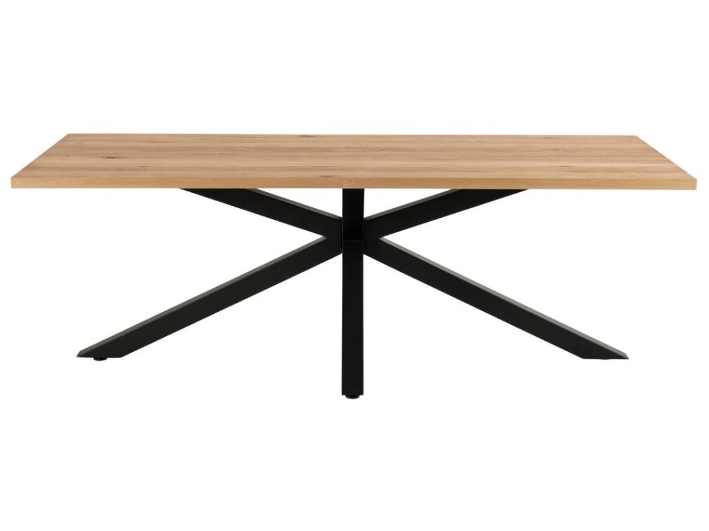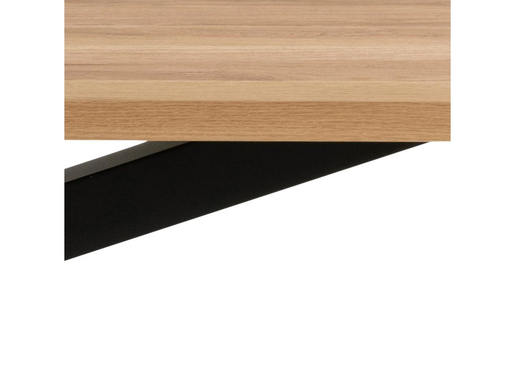 Tento velkorysý jídelní stůl spojuje rustikální přírodní krásu s moderním minimalismem. Deska z dýhy z divokého dubu s olejovaným povrchem působí přirozeně a hřejivě, přičemž zvýrazňuje jedinečný charakter dřeva. Robustní křížová základna z matné černé oceli s hrubým práškovým nástřikem dodává stolu výrazný kontrast a sochařskou siluetu.