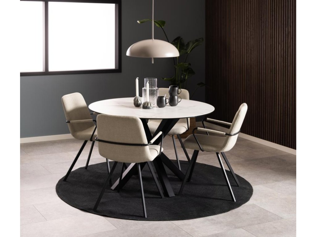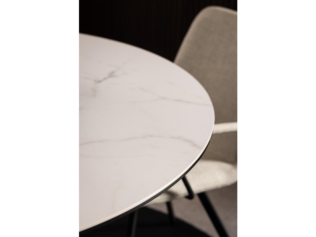 Kulatý stůl Heaven s bílou keramickou deskou Akranes v drsném provedení působí čistě a vzdušně. V kontrastu se sochařskou černou podnoží vzniká nadčasový kousek, který se hodí do světlých, skandinávských i moderních interiérů. Keramický povrch je nejen vizuálně atraktivní, ale také velmi odolný a praktický.