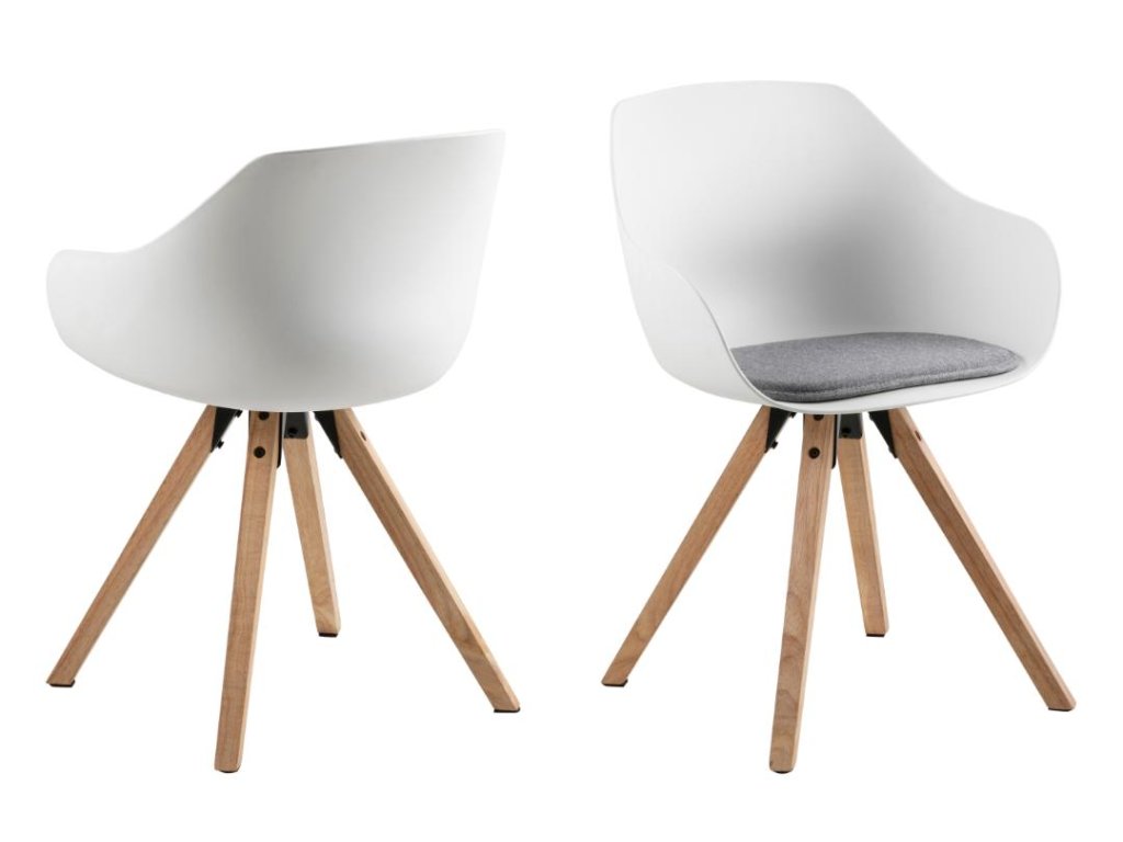 Křeslo Tina s loketními opěrkami kombinuje elegantní materiály a skandinávský styl. Sedadlo ve světle šedé látce je doplněno o bílý plastový rám a dřevěnou základnu z mořeného kaučukovníku. Pohodlí zvyšuje volný polštářek k sezení. V balení se nacházejí dvě křesla.