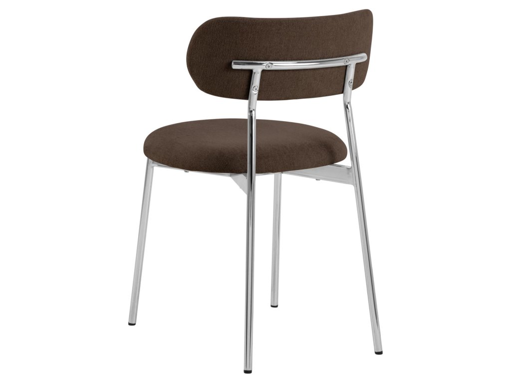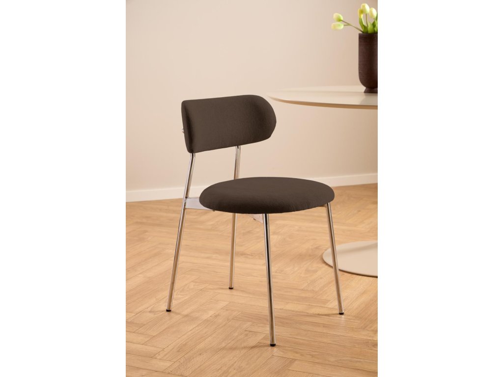 Jídelní židle Lyric v hnědém provedení spojuje retro-futuristický styl s moderní elegancí. Zaoblené sedátko potažené měkkou hnědou látkou připomínající žinylku dodává prostoru teplý a útulný tón. Lesklý trubkový rám a nohy z chromované oceli vytváří výrazný designový kontrast a zvyšují vizuální atraktivnost. Dodává se jako sada 2 kusů.