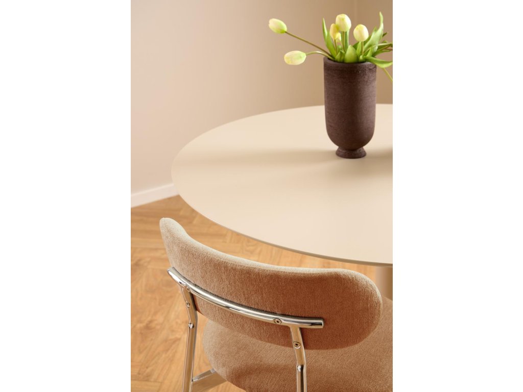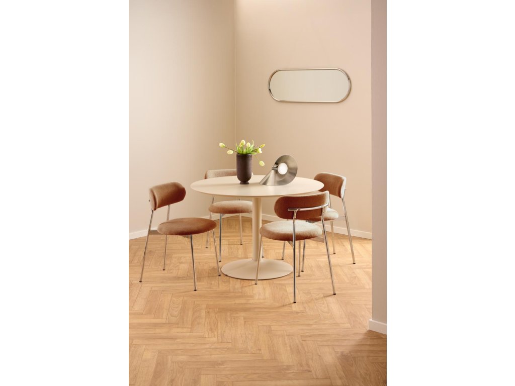 Jídelní židle Lyric přináší do jídelny retro-futuristický nádech a hravou atmosféru. Zaoblené sedátko je čalouněno terakotovou látkou podobnou žinylce, která působí měkce a příjemně. Lesklý trubkový rám a nohy z chromované oceli dodávají designu lehkost a výrazný moderní akcent. Židle je vyrobena z ohnivzdorných materiálů a má FSC™ certifikaci. Dodává se jako praktická sada 2 kusů.