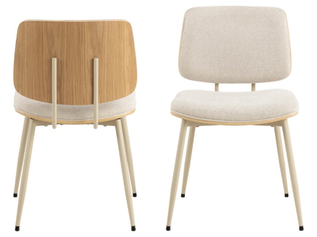 Jídelní židle Owen přináší jemnou, nadčasovou estetiku, která spojuje přírodní materiály s moderními prvky. Sedák a opěradlo z ohýbané lakované dubové dýhy vytvářejí teplý, přívětivý vzhled, zatímco béžová látka doplňuje celkový komfort. Dvě šedé trubky spojující sedák s opěradlem dodávají židli štíhlou siluetu a šedé ocelové nohy s hrubým práškovým nástřikem zajišťují stabilitu. Dodává se jako sada 2 kusů.