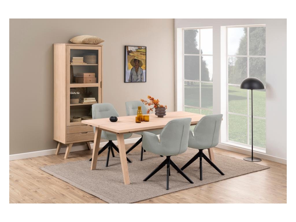 Jídelní křeslo Aura s područkami v čalounění Town světle šedá 13 spojuje elegantní design s praktickými funkcemi. Sedák i opěradlo jsou kompletně čalouněny stejnou látkou pro soudržný vzhled, zatímco decentní potrubí zvýrazňuje jemnou siluetu křesla. Čtyřramenný podstavec z matně černého lakovaného kaučukovníkového dřeva zajišťuje výbornou stabilitu a díky automatickému návratu se křeslo vždy vrátí do původní polohy – ideální řešení pro udržování vizuálního pořádku.