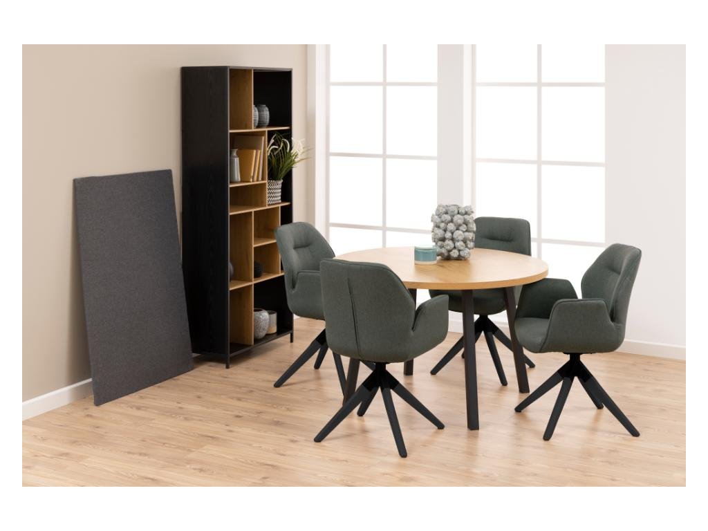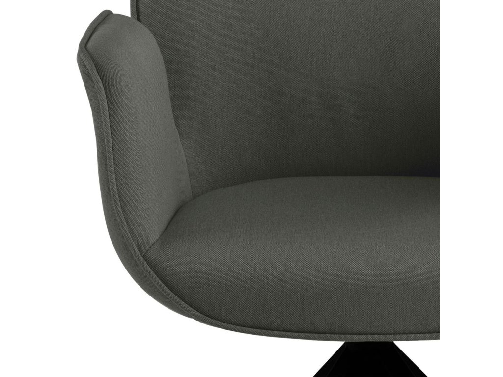 Jídelní křeslo Aura s područkami v čalounění Town tmavě šedá 33 spojuje elegantní design s praktickými funkcemi. Sedák i opěradlo jsou kompletně čalouněny stejnou látkou pro soudržný vzhled, zatímco decentní potrubí zvýrazňuje jemnou siluetu křesla. Čtyřramenný podstavec z matně černého lakovaného kaučukovníkového dřeva zajišťuje výbornou stabilitu a díky automatickému návratu se křeslo vždy vrátí do původní polohy – ideální řešení pro udržování vizuálního pořádku.
