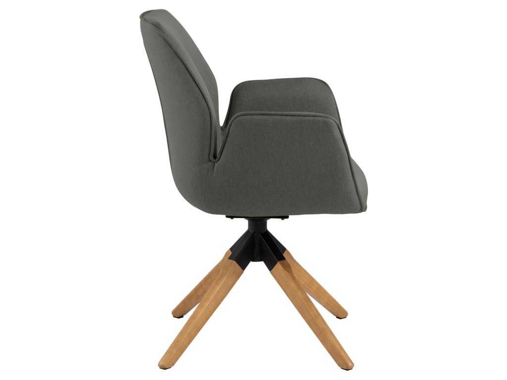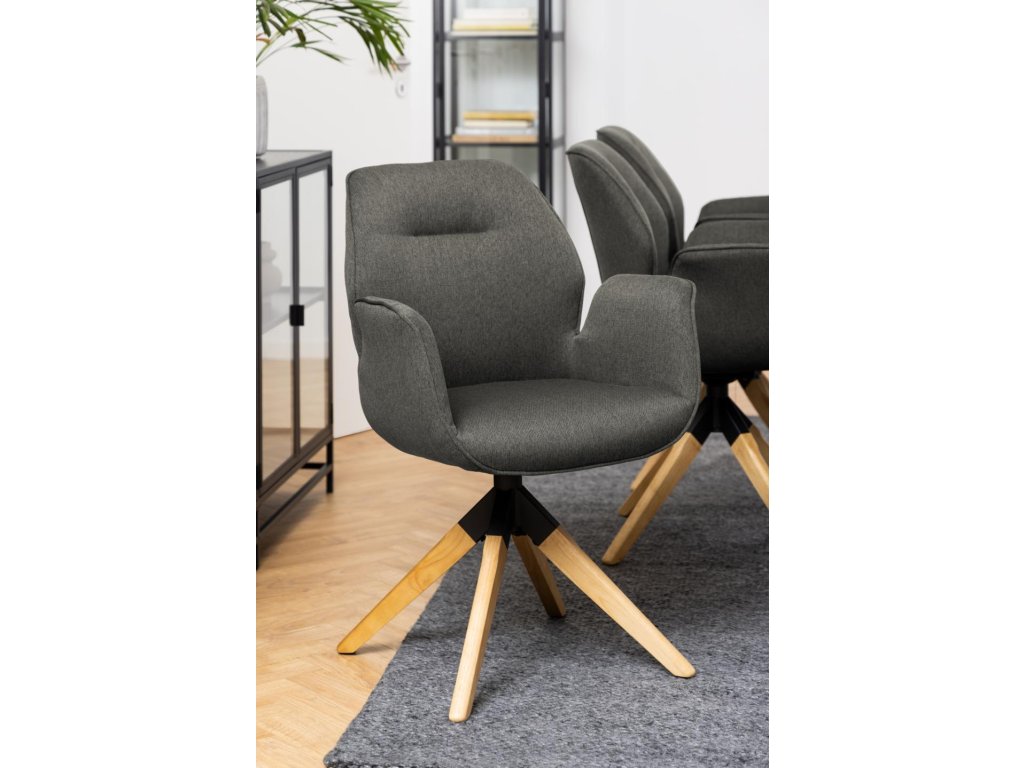 Křeslo Aura nabízí elegantní spojení tmavě šedé látky a přírodního dřeva. Jeho tvar a čalounění zaručují komfort při stolování. Základna z olejovaného kaučukovníku s automatickým návratem zvyšuje jeho praktičnost. Hodí se do stylových jídelen s přírodním designem.