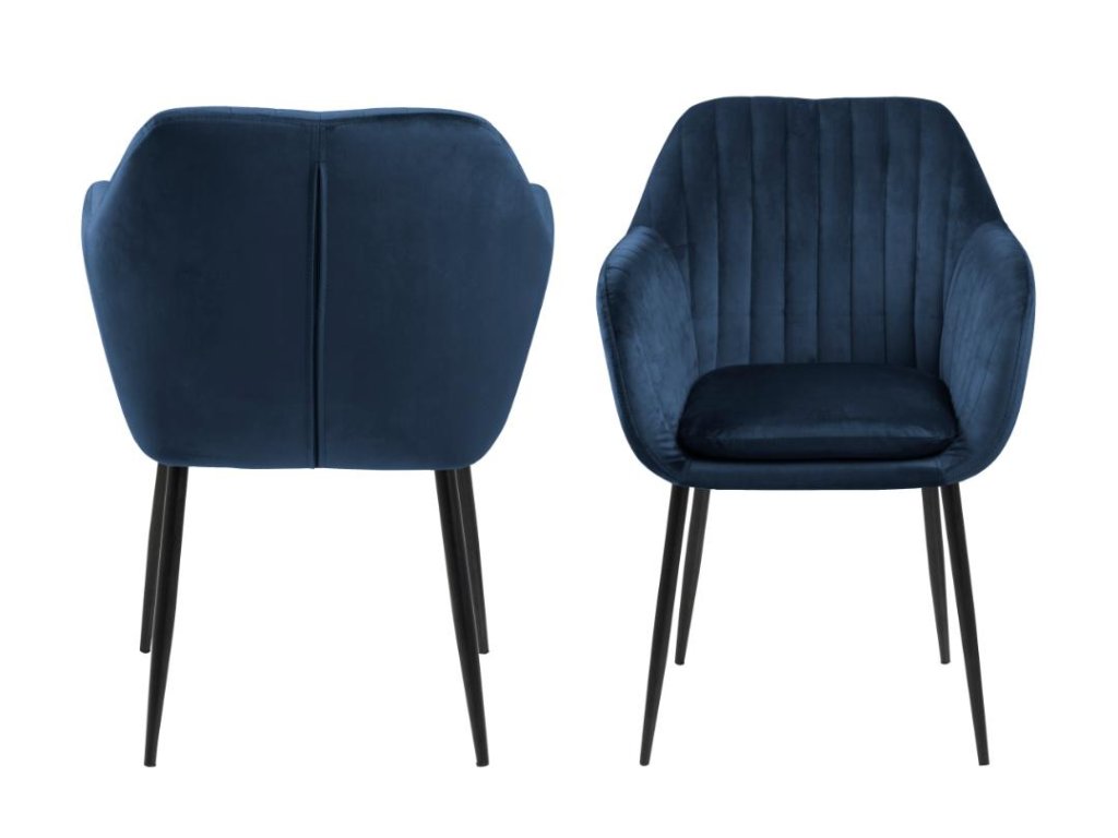 Křeslo Emilia v tmavě modré látce kombinuje komfort a moderní design. Pevná černá ocelová základna spolu s svislým prošíváním a loketními opěrkami zajišťuje pohodlí při delším sezení. Je vhodné do jídelních koutů i kanceláří. Elegantní čalounění dodává křeslu stylový vzhled.