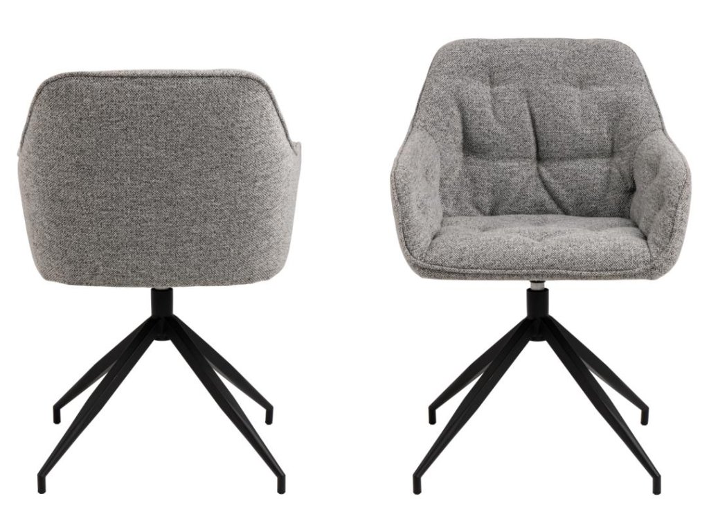 Křeslo Brooke v šedé barvě nabízí pohodlí při každém stolování. Černá ocelová podnož je pevná a zároveň stylová. Díky otočné funkci a čalounění je židle ideální pro dlouhé večeře nebo setkání u stolu.
