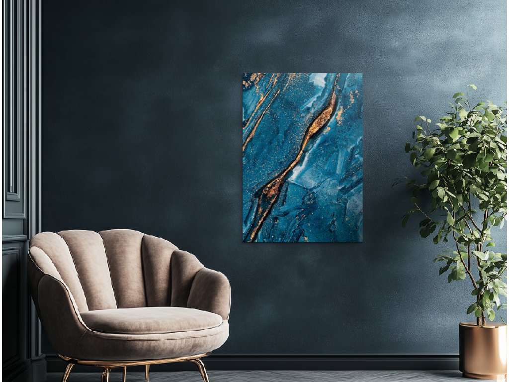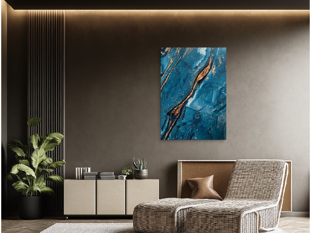 Mramorový obraz Tekuté zlato kombinuje abstraktní zlaté linie a tyrkysový epoxidově mramorový efekt, čímž vytváří jedinečný luxusní akcent na stěně. UV tisk zvýrazňuje detaily a barvy, které věrně imitují mramorový povrch. Je to moderní a elegantní doplněk, který dodá prostoru světlost, dynamiku a stylový charakter. Ideální volba pro milovníky minimalismu a luxusu.