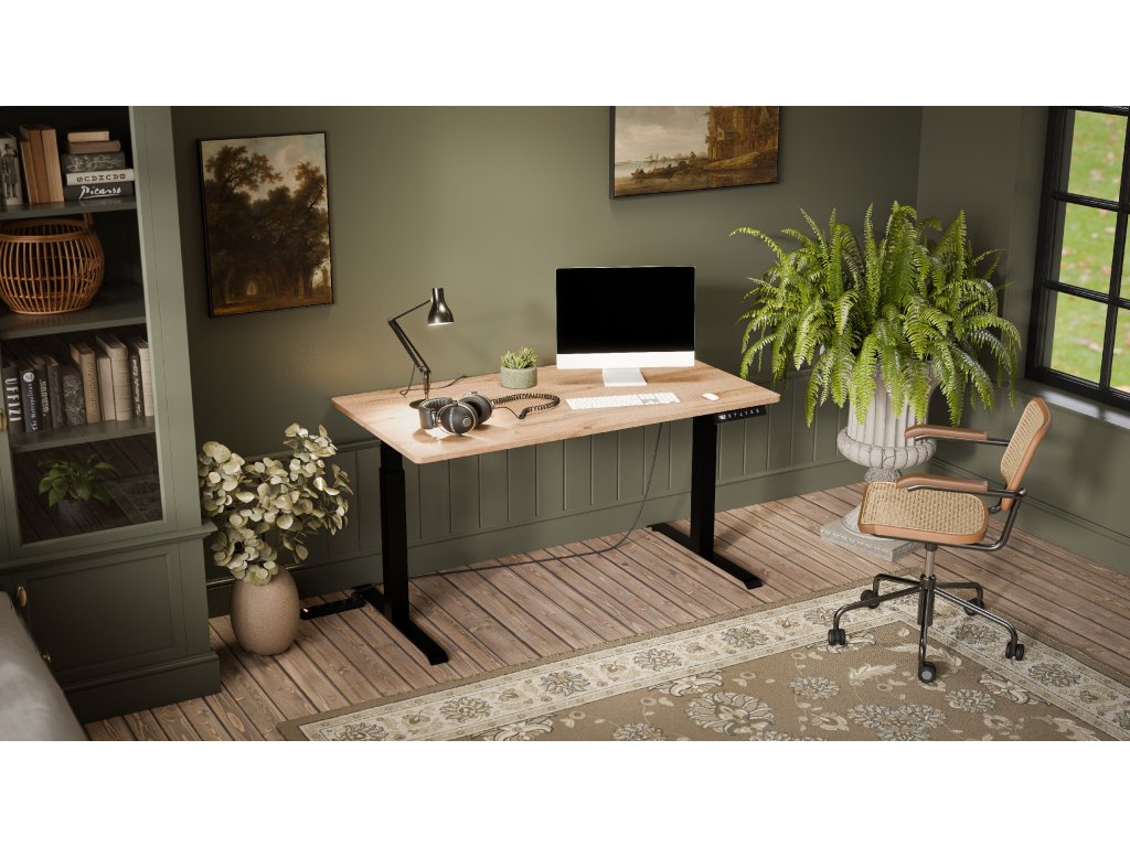 Spojení přírodního dekoru dub wotan s černou konstrukcí vytváří stylový a útulný pracovní prostor. Moony Long nabízí větší pracovní desku (150 × 80 cm), elektrické zvedání výšky a paměť tří poloh pro maximální komfort při práci.