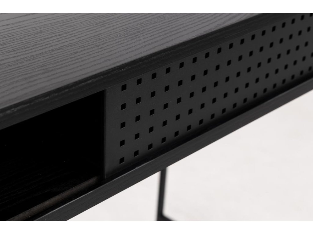 Stůl Angus spojuje přírodní vzhled popelavě-černého jasanu se subtilním ocelovým rámem v matné černé. Čisté linie a otevřená konstrukce působí odlehčeně, ale zároveň nabízejí pevnou pracovní plochu, která zvládne i náročný pracovní den. Pod deskou se ukrývá praktická police s kovovými posuvnými dvířky – ideální místo pro papíry či kancelářské potřeby, aby zůstal váš stůl vždy uklizený.