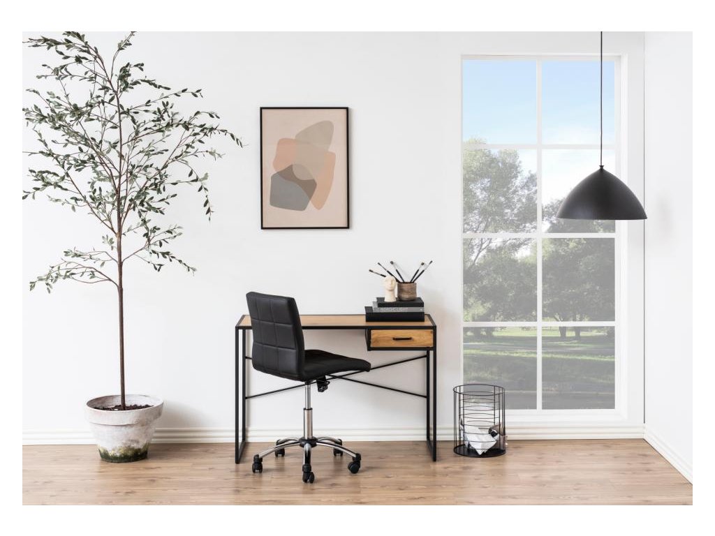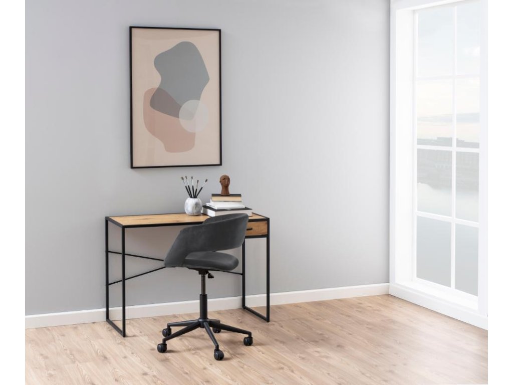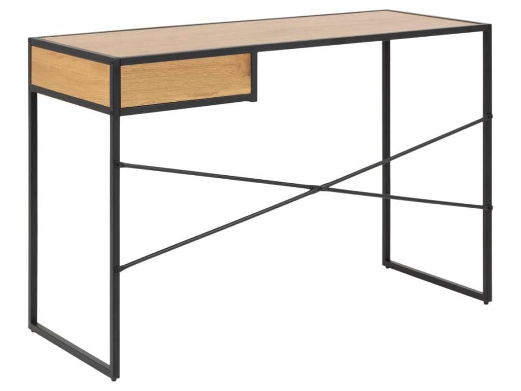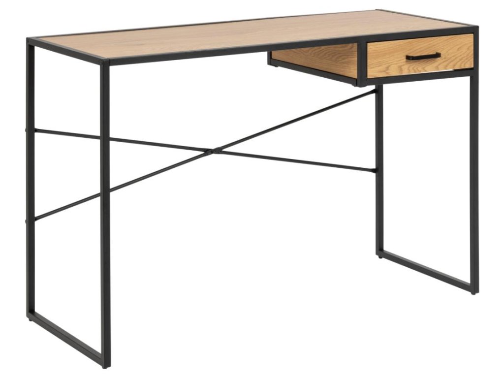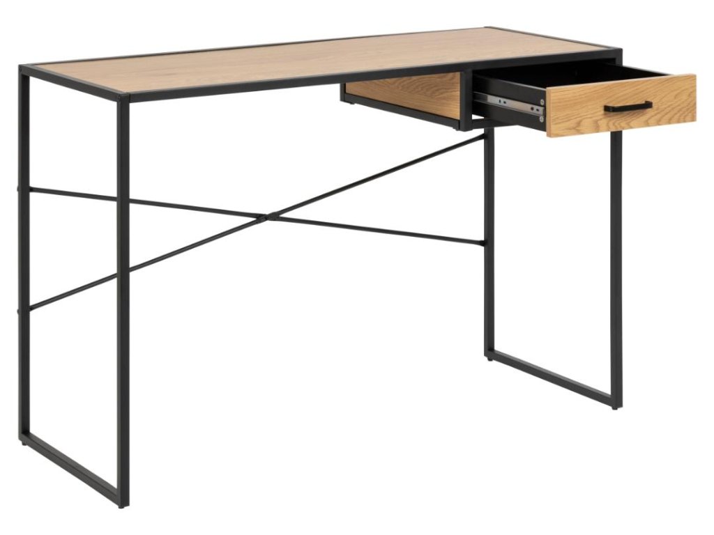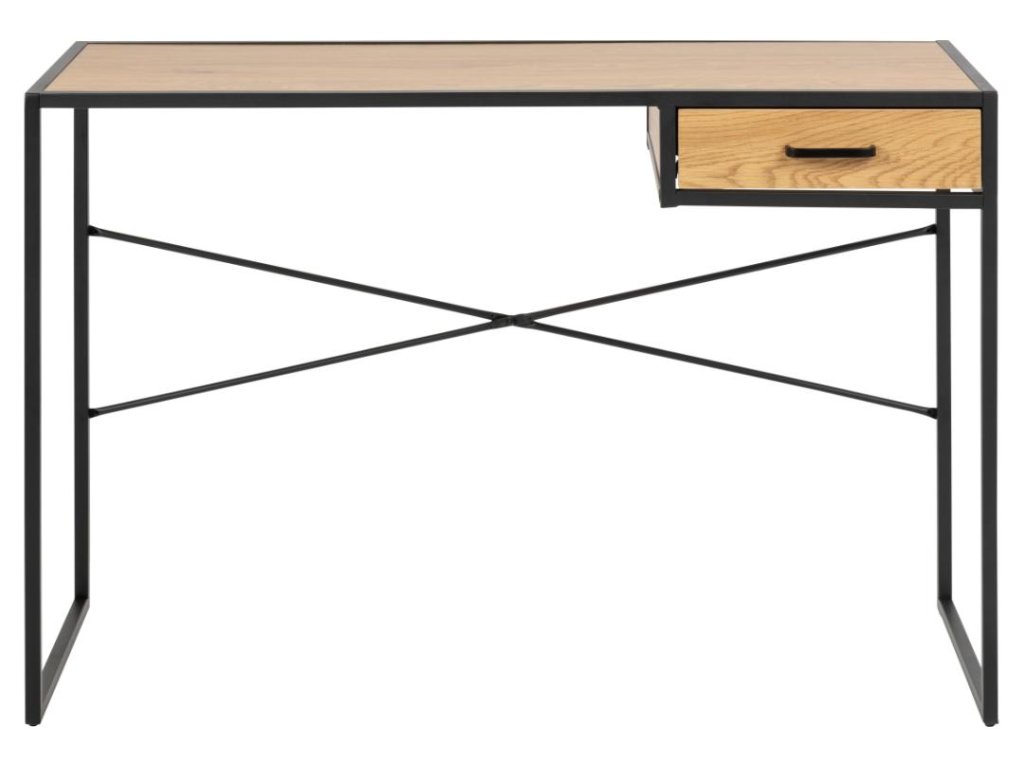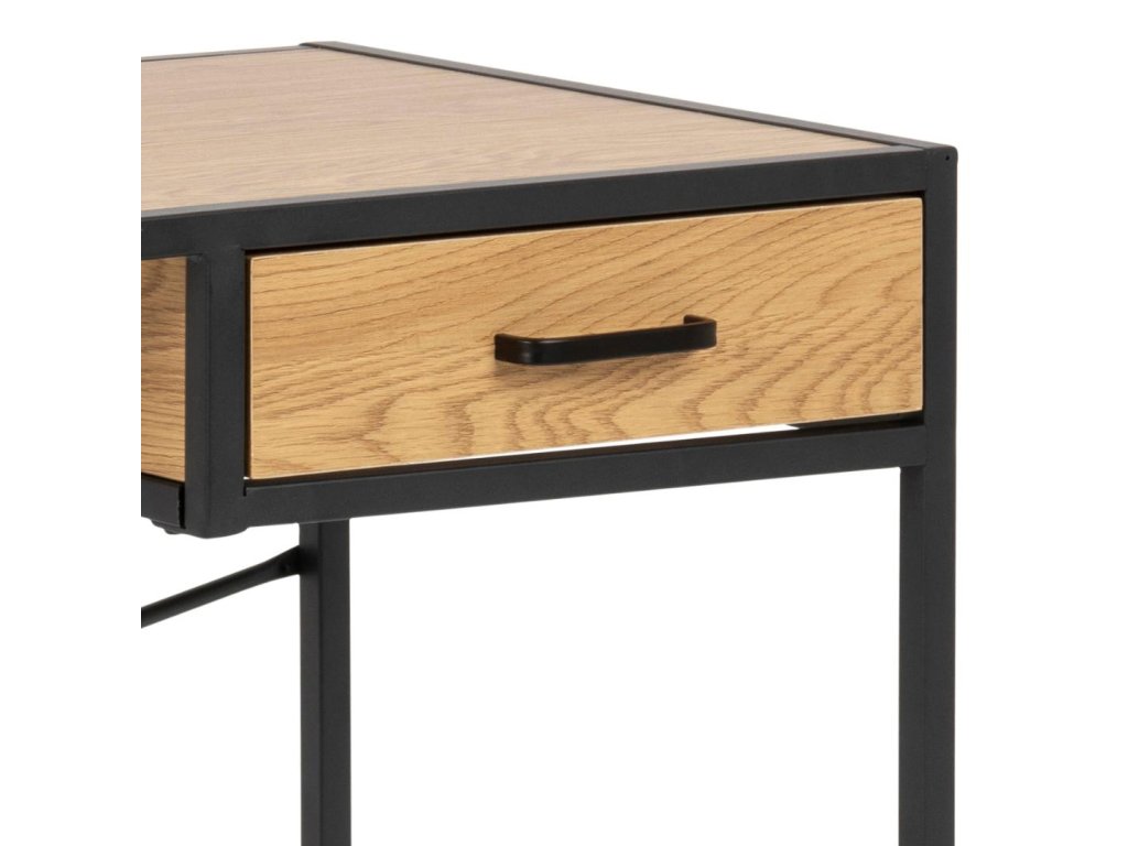 Kancelářský stůl Seaford 110B kombinuje pracovní desku v dekoru matného divokého dubu s pevnou černou ocelovou podnoží pro moderní industriální vzhled. Kovové kolejnice zásuvky zaručují hladké používání a kompaktní rozměry z něj dělají ideální pracovní stůl pro jakýkoli interiér. Praktický, stylový a připravený zvýšit vaši produktivitu.
