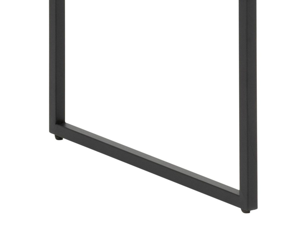 Stůl je pevně podepřen černou ocelovou podnoží typu sledge s hrubým práškovým nástřikem, která zajišťuje stabilitu a zároveň působí moderně a vzdušně. Zásuvka je vybavena kovovými kolejnicemi, což zaručuje hladké a spolehlivé otevírání.