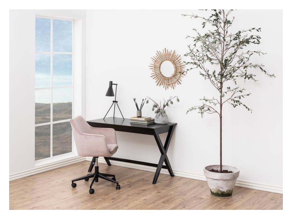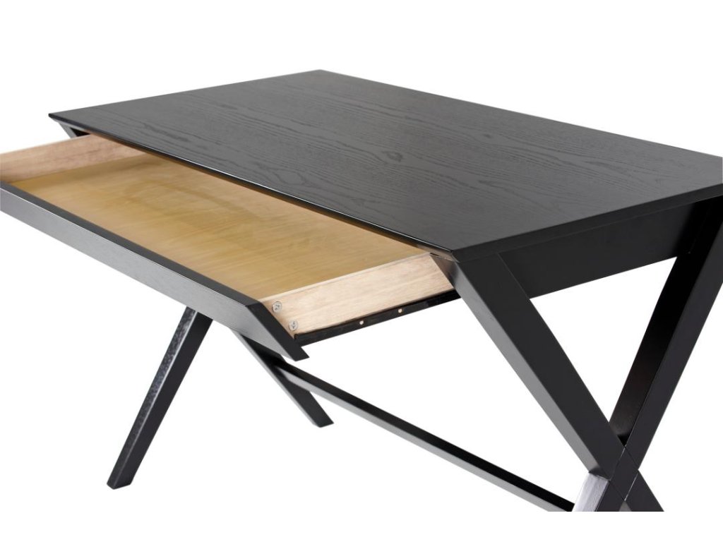 Kancelářský stůl Writex je navržen pro soustředěnou práci i tvůrčí projekty. Robustní černá konstrukce z lakované dubové a kaučukovníkové dýhy v kombinaci s praktickým otvorem pro kabely zajišťuje čistý a funkční pracovní prostor. Zásuvka s kovovými kolejničkami poskytuje dostatek úložného prostoru pro potřebné věci, které nechcete mít přímo na desce. Nohy ve tvaru X dodávají stabilitu i designový výraz.