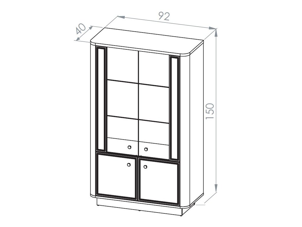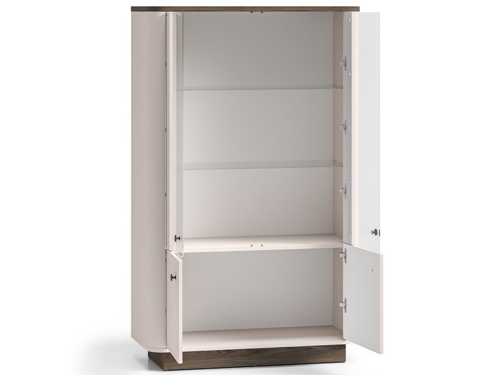 Nízká vitrína Vilavio 02 je elegantním kouskem, který v sobě spojuje moderní design a funkční řešení úložného prostoru. Horní část vitríny obsahuje dva prosklená dvířka s dvěmi skleněnými policemi, které jsou ideální pro vystavení dekorací, skla či porcelánu. Spodní část disponuje dvěmi plnými dvířky, za kterými se nachází praktický uzavřený prostor bez polic, vhodný pro uložení věcí, které chcete mít skryté.