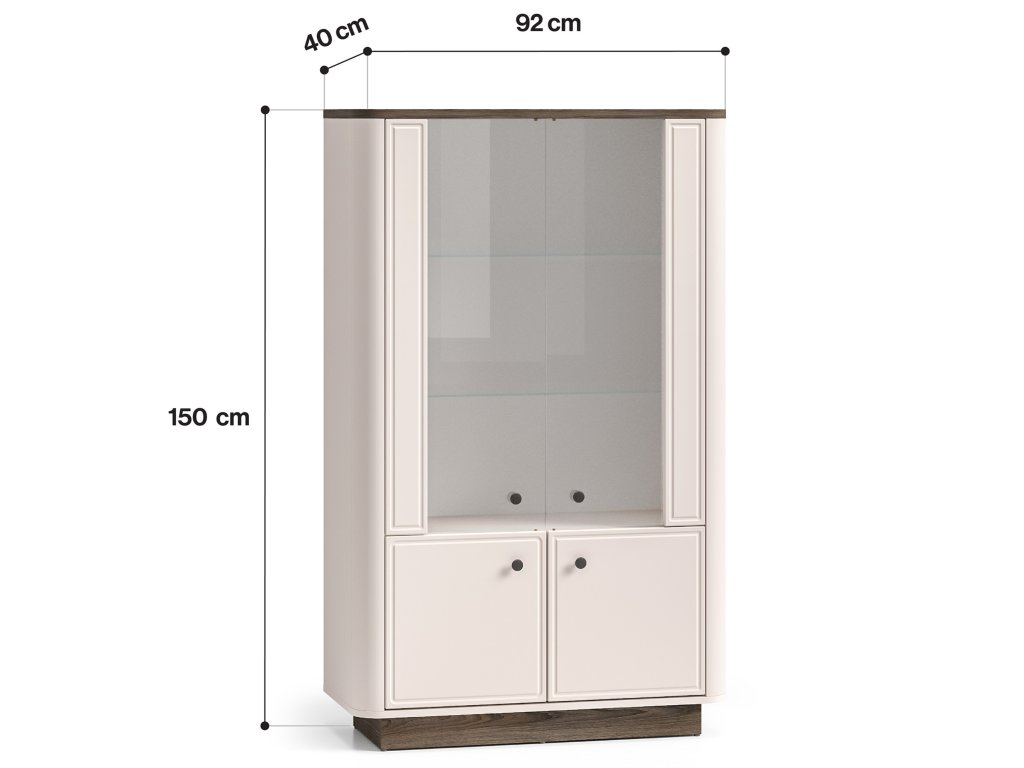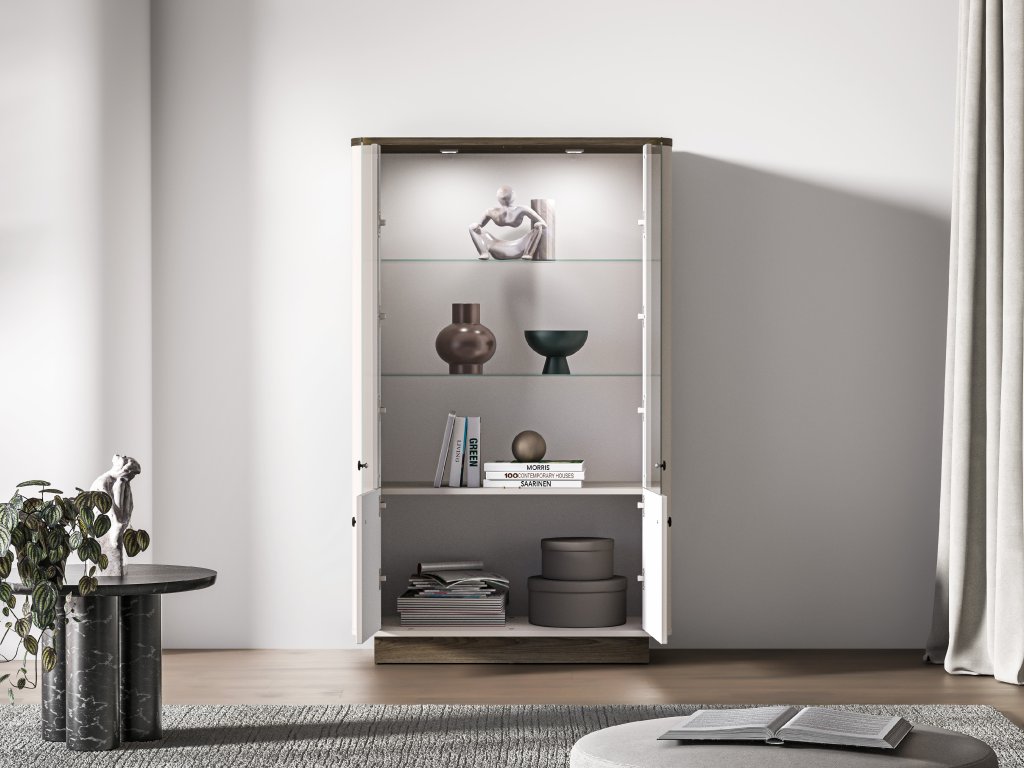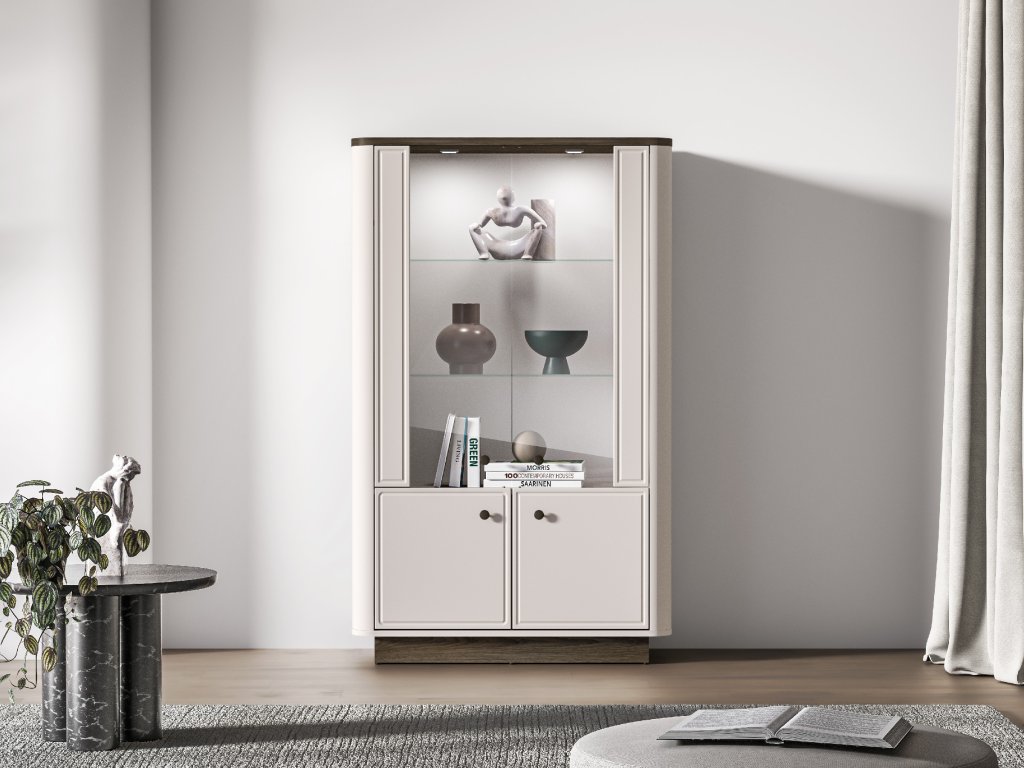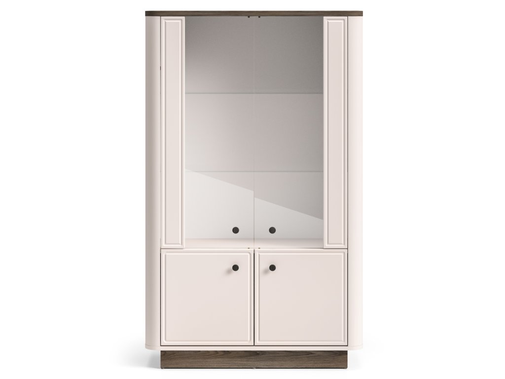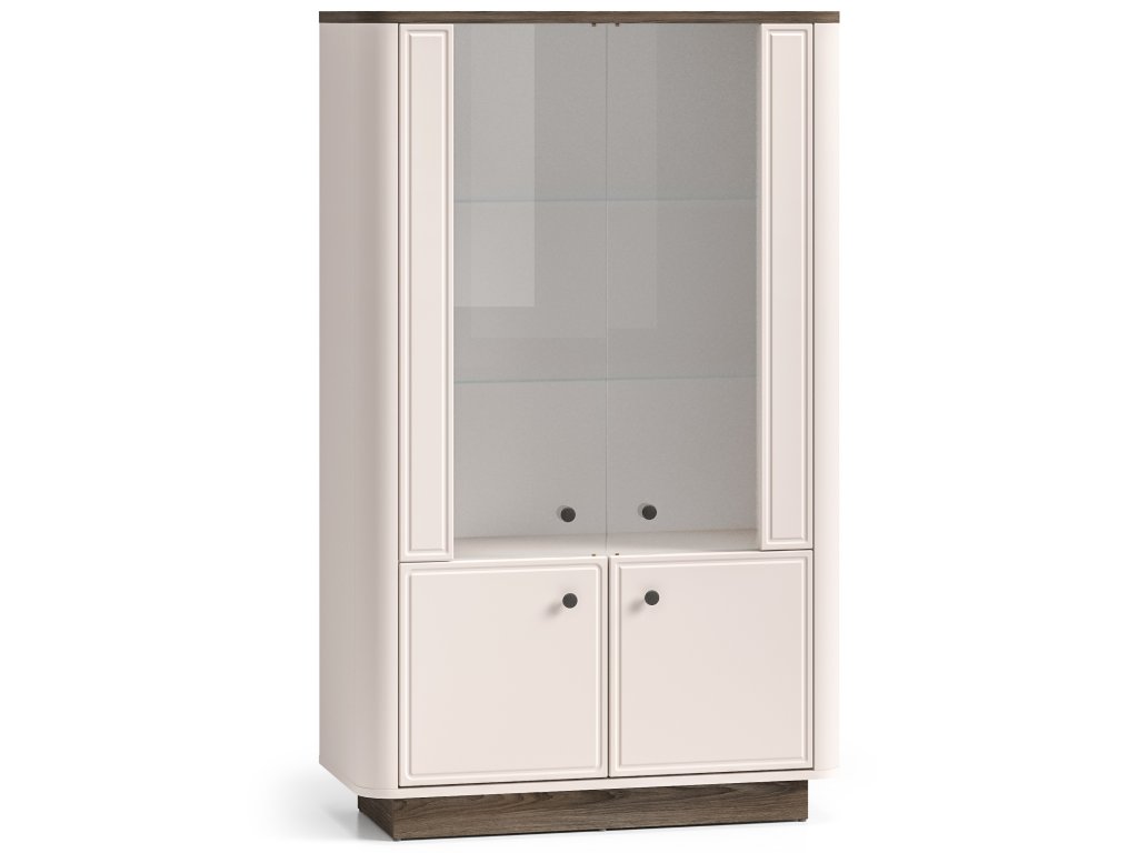 Vitrínu lze doplnit o stylové LED osvětlení (za příplatek), které dodá interiéru příjemnou atmosféru a podtrhne. Kombinace dekorů kašmírově béžová / dub tmavý, jemně zaoblené hrany a elegantní kovové úchytky v odstínu broušená stará měď vytvářejí harmonický celek s nadčasovým vzhledem.