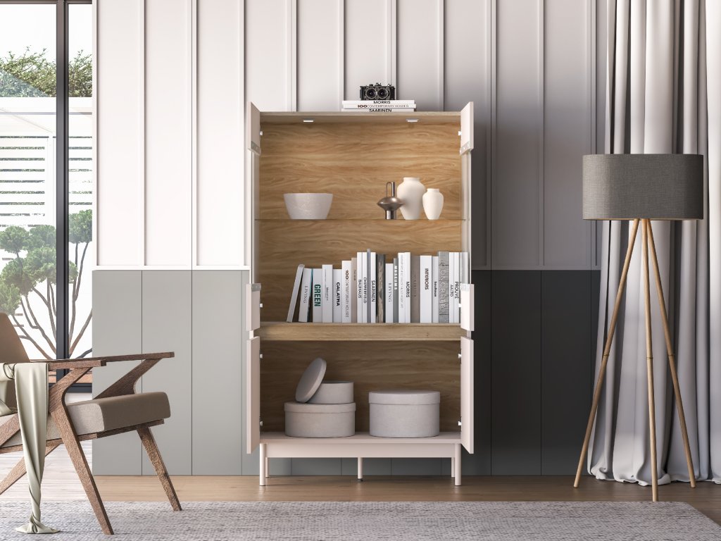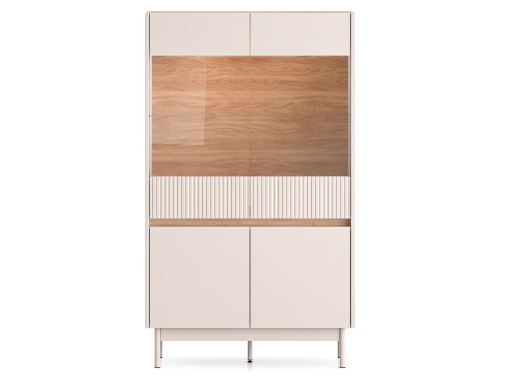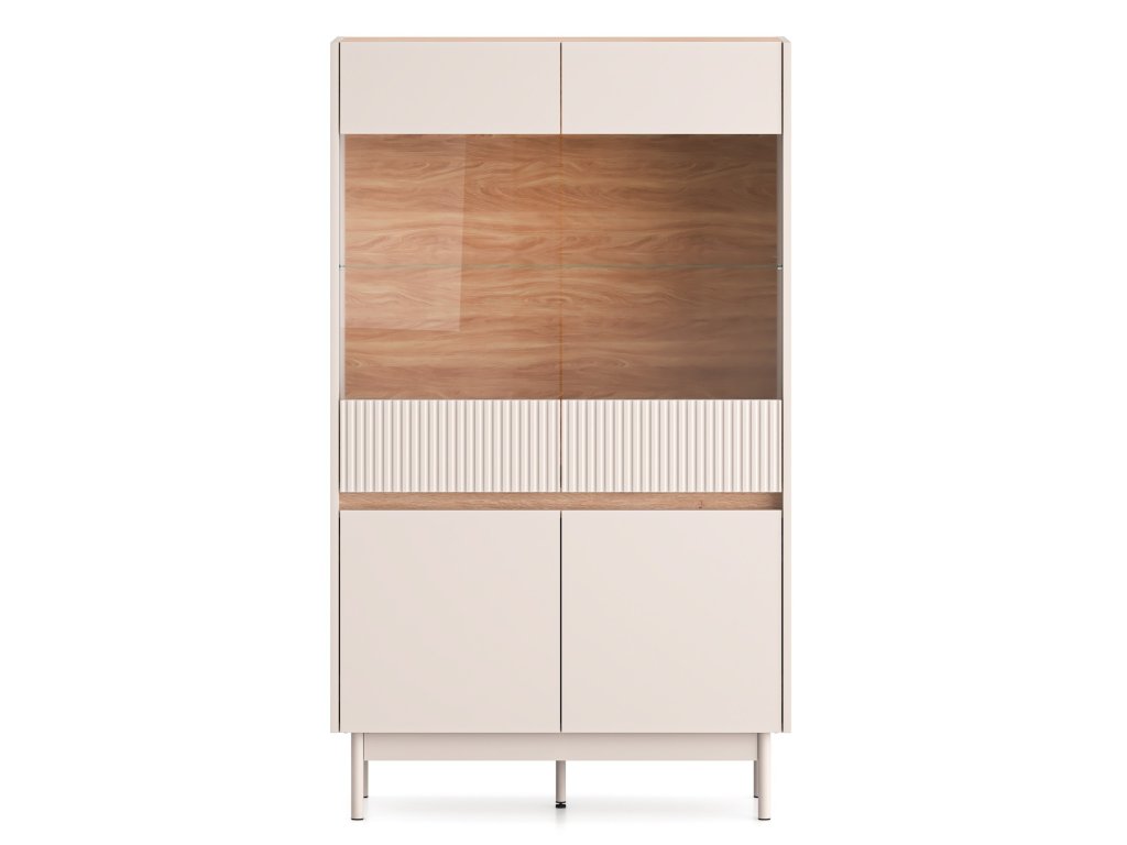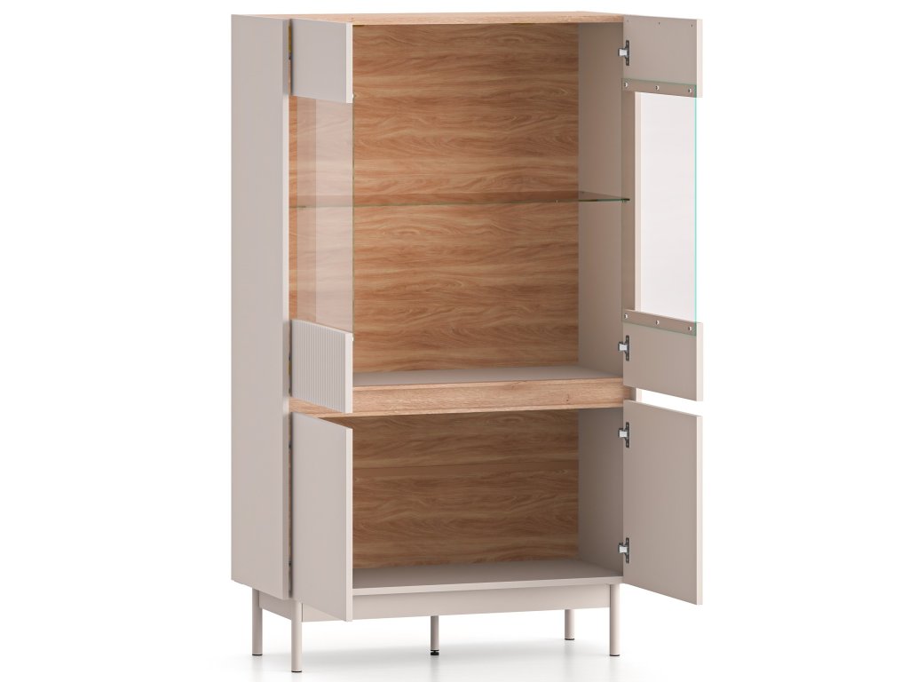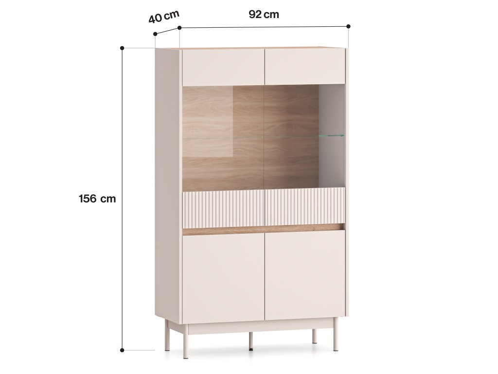 Vitrína má rozměr 92 × 40 x 156 cm, díky čemuž poskytuje dostatečný objem a zároveň si zachovává lehkost působení. V kombinaci kašmírově béžové a dekoru dub krémový, s možností osvětlenía moderních jídelníček i moderních interiérů, místností.
