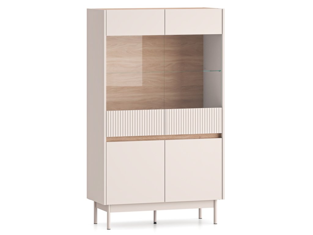 Vitrína Dunea 03 v kašmírově béžové a dekoru dub krémový je ideálním nábytkem pro ty, kteří hledají elegantní řešení pro vystavení i uskladnění. Horní prosklená část s policí umožní vystavit dekorace či nádobí, spodní část poslouží k praktickému uložení. Stabilní kovové nožičky a možnost doplnit LED osvětlení podtrhují styl vitríny. Díky tichému zavírání dvířek je její používání příjemné a komfortní. Skvěle se hodí do moderních i klasických interiérů.