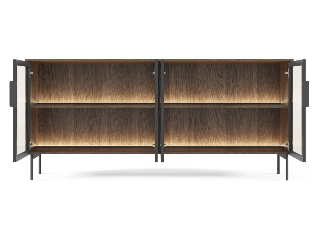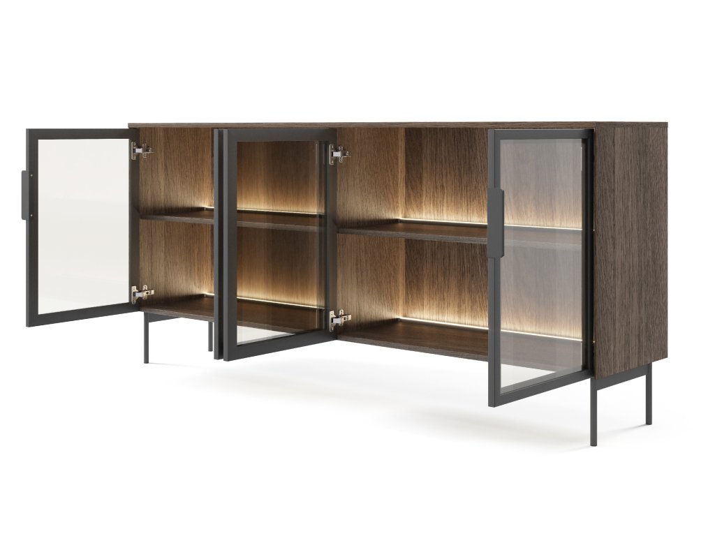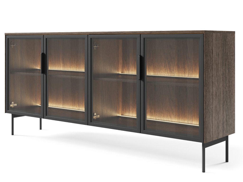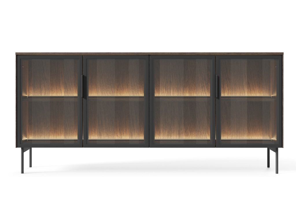 Vitrína Lumus B v širším formátu je skvělým řešením pro ty, kteří hledají více úložného prostoru i místa pro vystavení dekorací. Kombinuje moderní vzhled s funkčností – celá vitrína je prosklená a podsvícená teplým bílým LED osvětlením, které dodá prostoru hřejivou atmosféru. Skleněná část je vyrobena z hnědého tvrzeného skla typu antisol, elegantně orámovaného černým MDF rámem. V kombinaci s tmavým dekorem dubu dunin a černými kovovými prvky vytváří dojem prémiového nábytku vhodného do sofistikovaného interiéru.