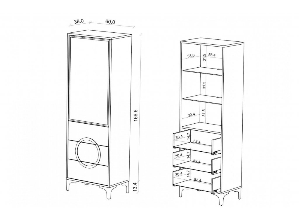 Modernistický styl doplňují ocelové, chromové nohy, které se zrcadlovým dekorem, hliníkovým rámem se skleněnými dveřmi a černou barvou dělají tento kus jedinečným. Je doplněn o osvětlení polic v zasklené části. Vitrína disponuje 3 prostornými zásuvkami a skříní uzavřenou prosklenými dvířky. Na vitríně nenajdete úchyty, namísto nich je použit systém otevírání Push to Open. Zásuvky používají moderní, nastavitelné vodící lišty namontované zespodu, díky čemuž jsou neviditelné a fungují snadno. Přední část a tělo jsou vyrobeny z lesklé černé desky. Spodek a boky zásuvek jsou černé (matné).