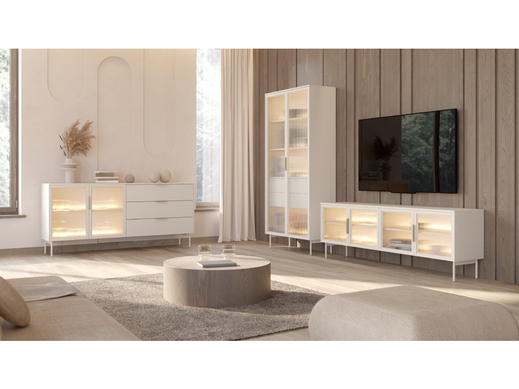 Kolekce Lumus staví na luxusní kombinaci materiálů – laminovaná deska a rámová dvířka z MDF, doplněná o ornamentálně tvrzené sklo s jemným reliéfem. Vše je promyšleně sladěno v odstínu béžové kašmírové barvy, který působí nadčasově a uklidňujícím dojmem. Detaily jako zlaté kovové úchytky, metalické nožičky, kvalitní ABS hrany, plnovýsuvné zásuvky a decentní LED osvětlení dělají z kolekce ideální volbu pro elegantní a funkční bydlení. Vitrína je ukázkou toho, jak lze spojit styl, praktičnost a jemnost v jednom kuse nábytku.