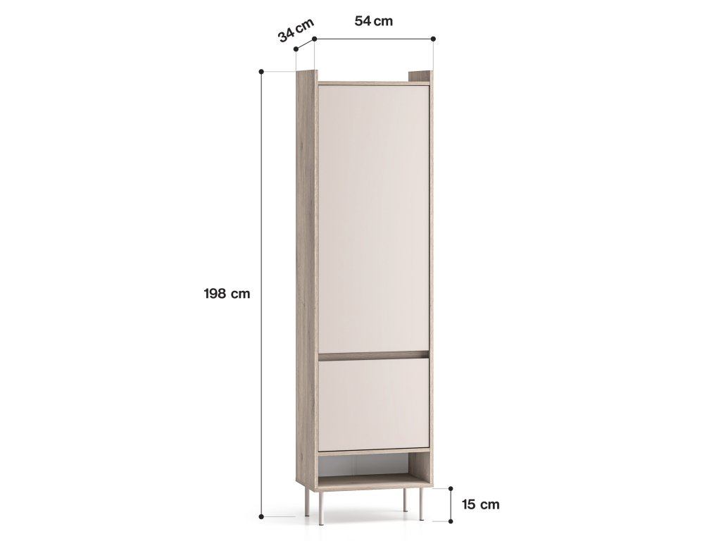 Minimalistické kašmírově béžové fronty v kombinaci s dubem krémovým dodávají skříni elegantní vzhled, který doplňují vysoké kovové nohy v odstínu kašmíru. Předsíňová skříň je navíc vybavena mechanismem tichého dovírání, takže její používání je pohodlné a bezpečné.