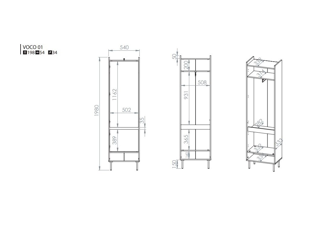 Předsíňová skříň Voco 01 je praktickým řešením pro odkládání oblečení a doplňků v úzkém, ale vysokém formátu. Díky rozměrům 54 × 34 × 198 cm nezabírá mnoho místa, ale přesto nabízí přehledné úložné řešení. Za dvoudveřovým čelem se ukrývá výsuvný věšák, který usnadňuje přístup k zavěšeným kabátům a bundám, ak tomu i dvě praktické police na obuv či drobnosti.