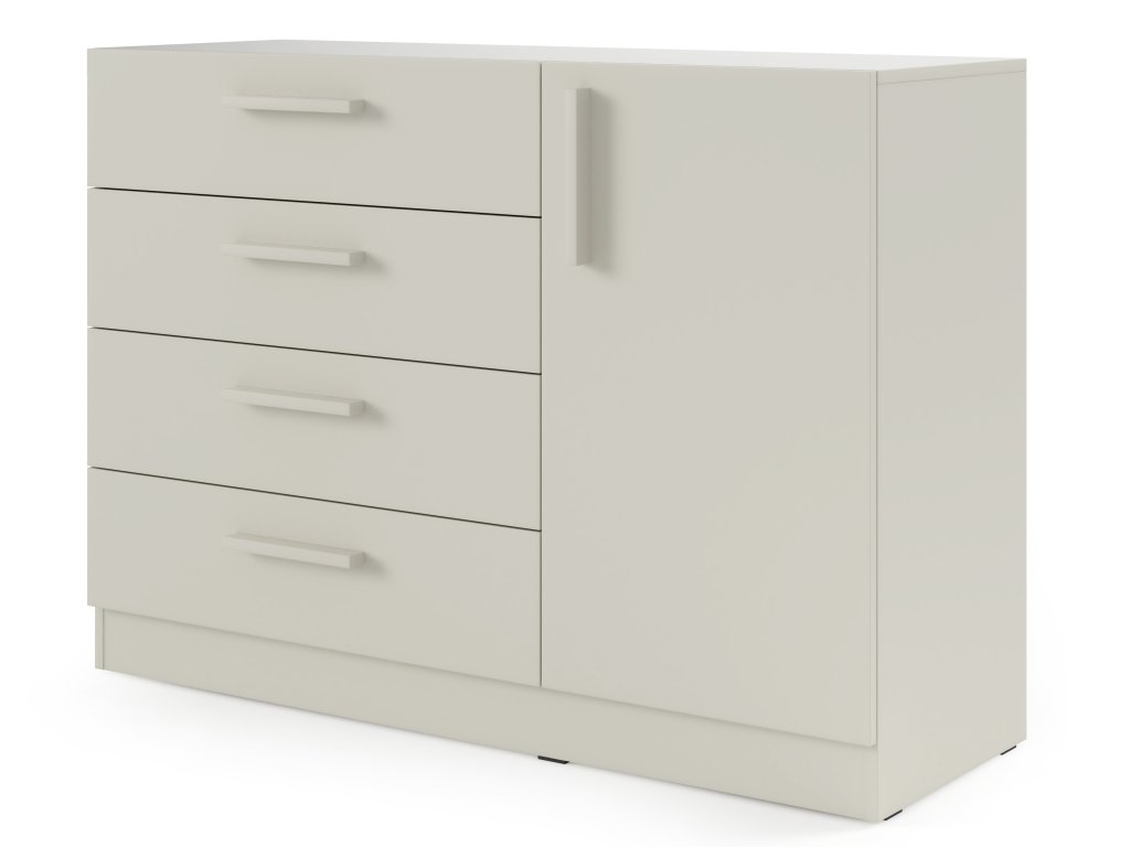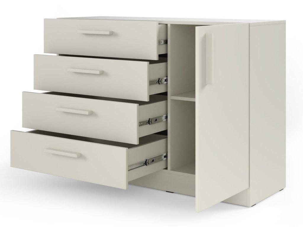 Komoda Braga BRK2 v elegantnom odtieni béžová (kašmírová) ponúka praktické riešenie úložného priestoru. Na ľavej strane sa nachádzajú štyri zásuvky s plným výsuvom, zatiaľ čo pravá časť obsahuje skrinku s dvierkami a policou, ktorá je ideálna na uloženie väčších vecí. Jemná kašmírová farba dodáva nábytku moderný a harmonický vzhľad.