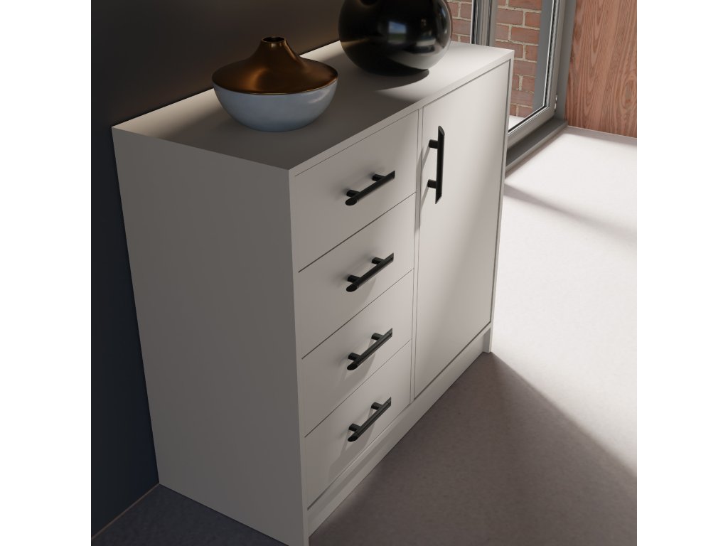 Komoda Smart - malá z portfolia sektorového nábytku se uplatní v jakékoli místnosti. Včetně ložnice, obývacího pokoje, chodby nebo studentského či dětského pokoje. Díky 4 zásuvkám a skříňce s dvířky bude uložení oblečení, oděvních doplňků a různých předmětů jednoduchou záležitostí. Komoda je však nejen praktická, ale také dobře vypadá. Ve srovnání se skříněmi šetří místo a opticky působí mnohem snáze. Nad komodu můžete umístit obraz, nebo položit na ni dekorační předměty, sošky, popřípadě rodinné fotografie.