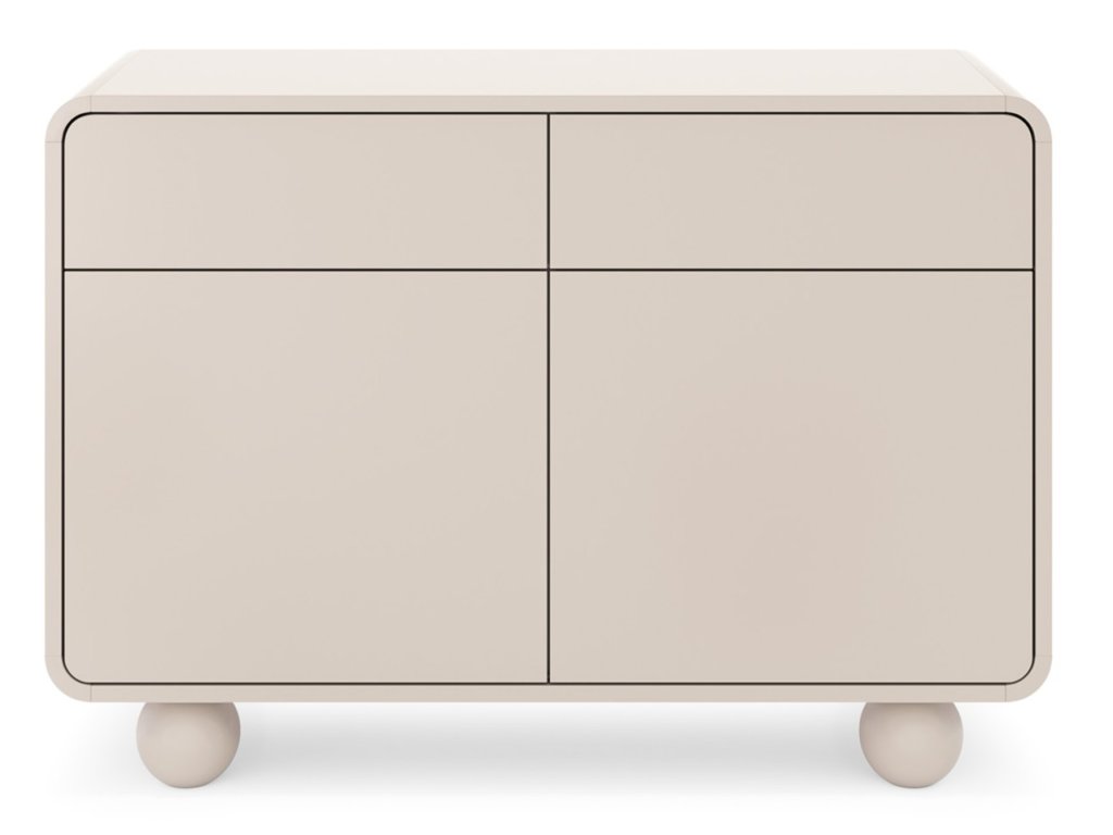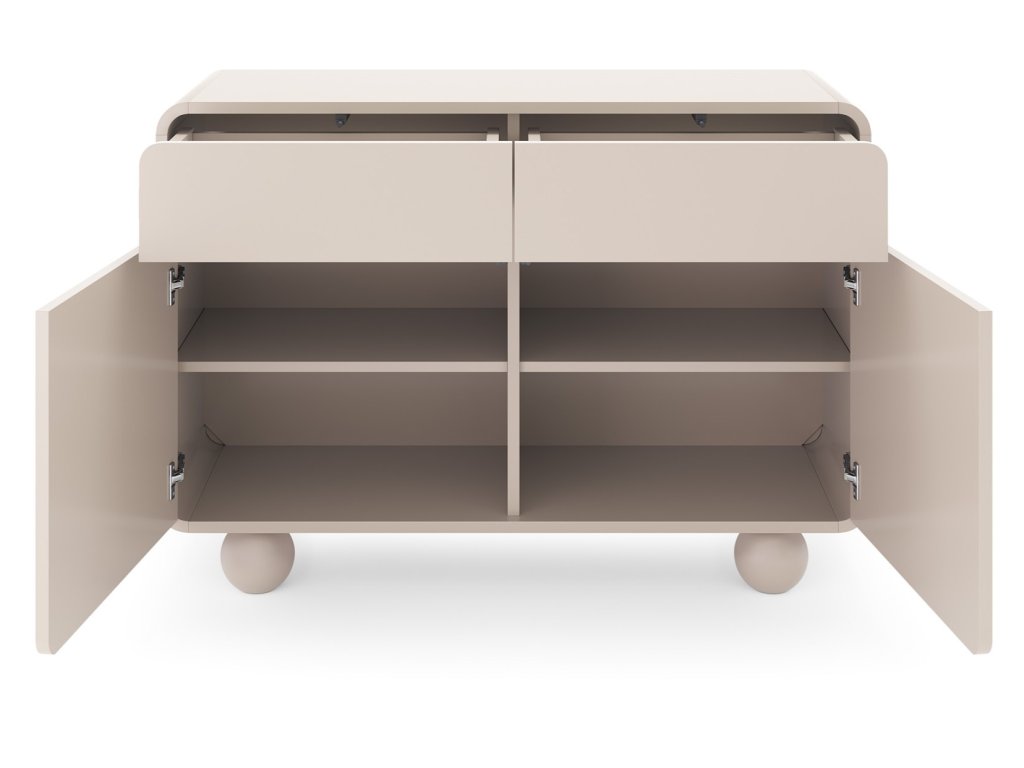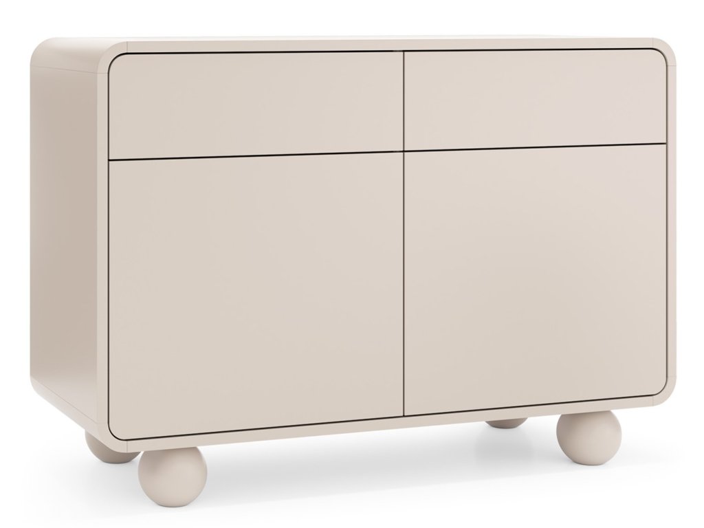 Dvoudveřová komoda Albion – béžová (kašmír) nabízí praktické řešení s 2 zásuvkami a skříňkou s dvířky. Moderní design bez úchytek se systémem push-to-open, tichým dovíráním a nohama ve tvaru koule činí z této komody elegantní a funkční kousek.