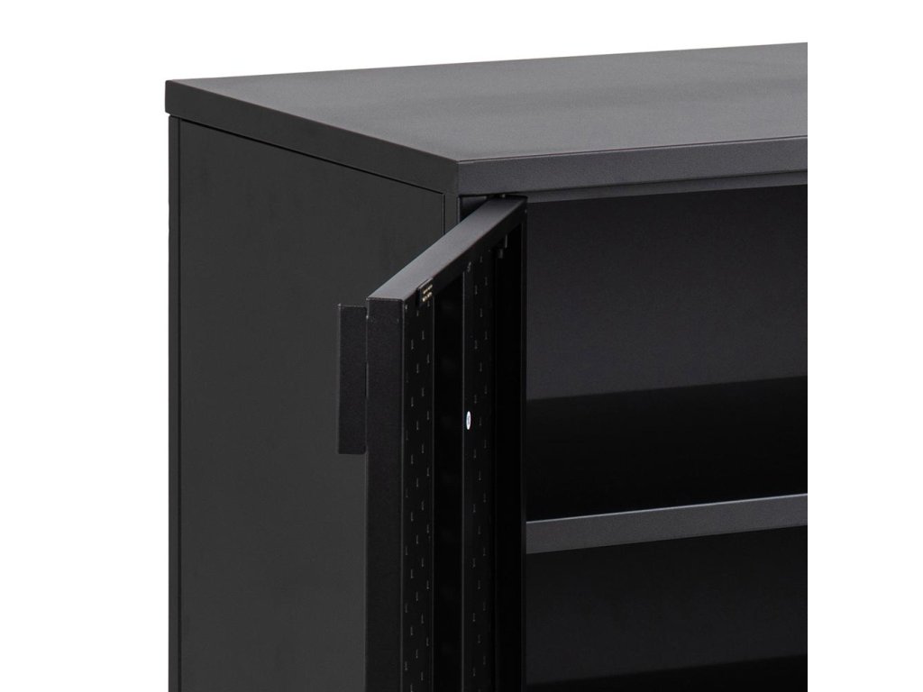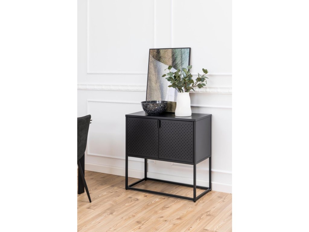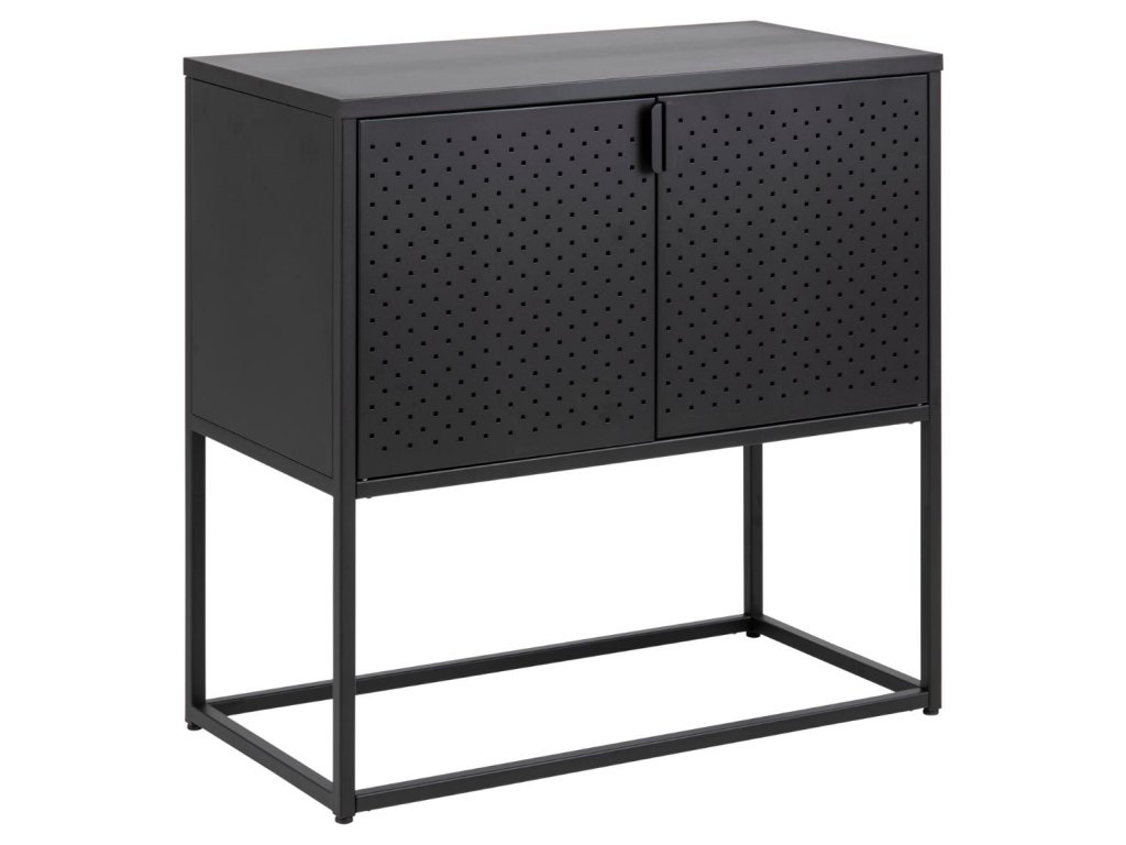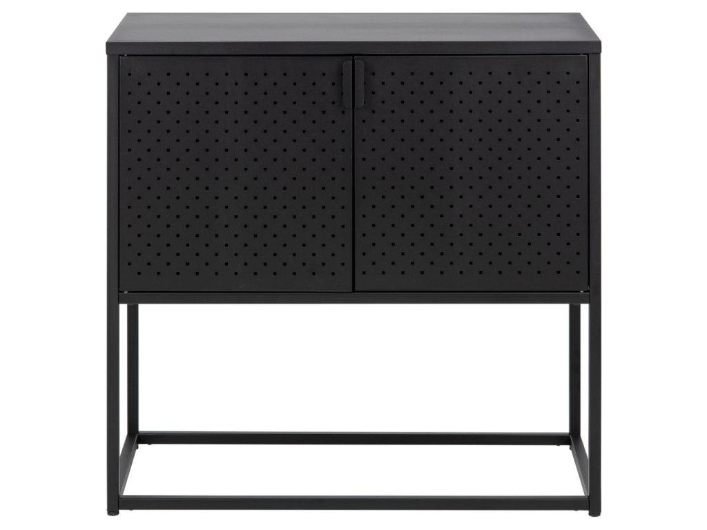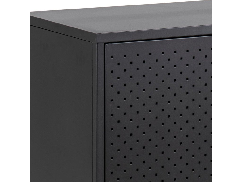 Kompaktní industriální komoda Newton z matné černé oceli s dvířky z kovové síťoviny. Nabízí moderní vzhled a praktický úložný prostor v podobě jedné police – ideální do chodby, obývacího pokoje či kanceláře.