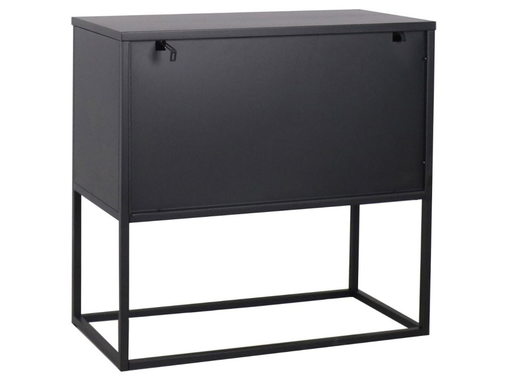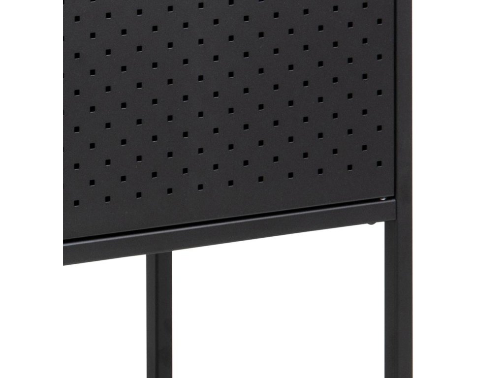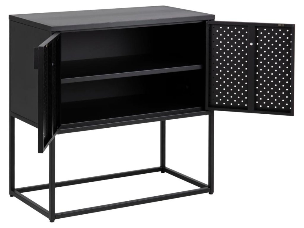 Komoda Newton představuje čistou esenci industriálního stylu – od vrchní desky až po pevné nohy je celá vyrobená z oceli s matným černým hrubým práškovým nástřikem. Kovová síťovina na dvířkách dodává designu moderní charakter a zároveň nechává jemně prosvítat uložené předměty.