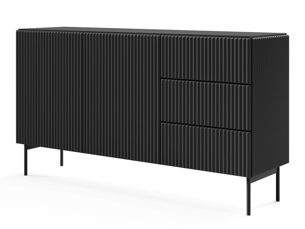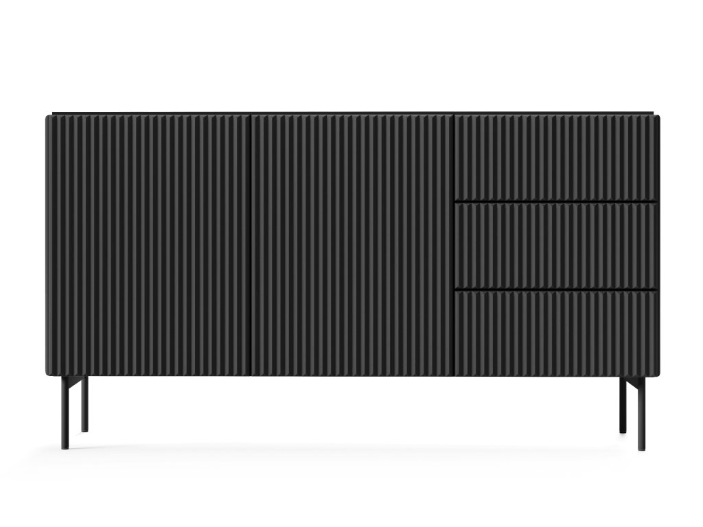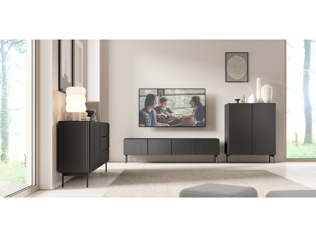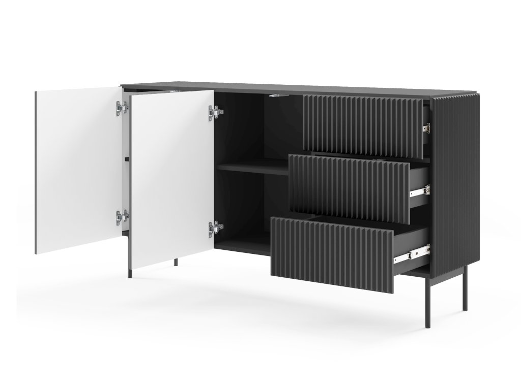 Kolekce Muti v provedení černý dekor je postavena na kontrastu mezi hlubokým matným povrchem a plastickým rýhováním čel a boků. Každý kus má ABS hrany, otevírání systémem push-to-open nebo kvalitní kuličkové výsuvy s plným výsuvem a stojí na černých kovových nohách, které dodávají stabilitu i vzdušnost. Vnitřek nábytku tvoří černá HDF deska, která podporuje celkový tmavý elegantní vzhled. Muti je kolekce pro ty, kteří milují geometrickou čistotu a výrazný styl bez zbytečností.