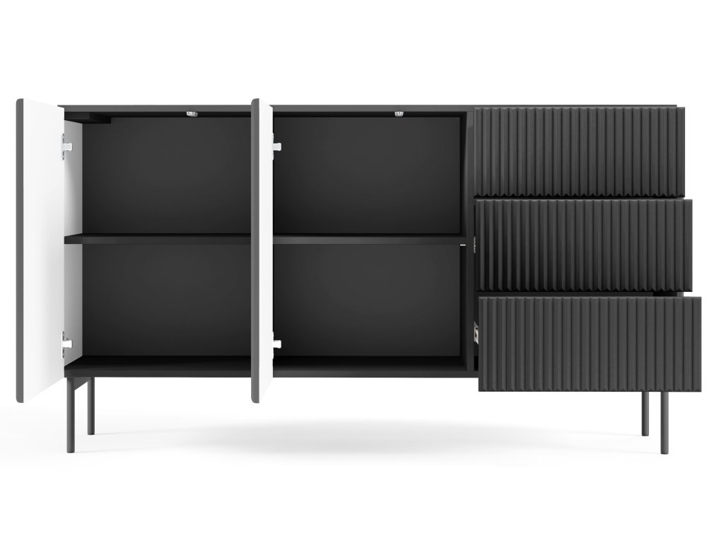 Dvoudveřová komoda se zásuvkami Muti D je kompaktní, ale díky dobře rozdělenému vnitřnímu prostoru mimořádně praktická. Tři zásuvky a skříňka s policemi nabízí flexibilitu při ukládání. Rýhovaná čela, černý dekor a push-to-open systém tvoří elegantní celek bez úchytek. Skvěle se hodí do menších interiérů, kde záleží na stylu i funkci.