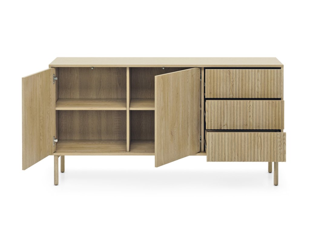 Komoda Tavo B v příjemném dekoru dub krémový spojuje funkční úložný prostor a nadčasový design inspirovaný přírodou. Tři zásuvky a dvoudveřová skříňka s policemi nabízí ideální řešení pro uložení oblečení, dokumentů, nádobí či jiných domácích potřeb, a to vše v kompaktním, ale prostorném formátu. Frézovaná MDF čela dodávají nábytku charakter a řemeslný vzhled, zatímco push-to-open mechanismus zajišťuje snadné otevírání bez úchytek. Celkový vzhled doplňují dřevěné nožičky a kontrastní vnitřní dekor dub sonoma, díky čemuž působí komoda přirozeně, čistě a útulně.