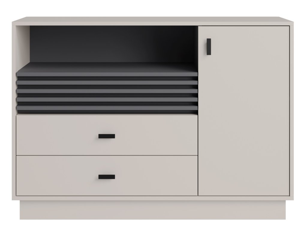 Elegantní komoda do obývacího pokoje, je vyrobena v moderním designu. Kombinace kašmírově béžové barvy a antracitu vnese do interiéru příjemný design. Komoda je snadno kombinovatelná s jiným nábytkem z kolekce Allmo, a se svými rozměry ji vejdete opravdu všude