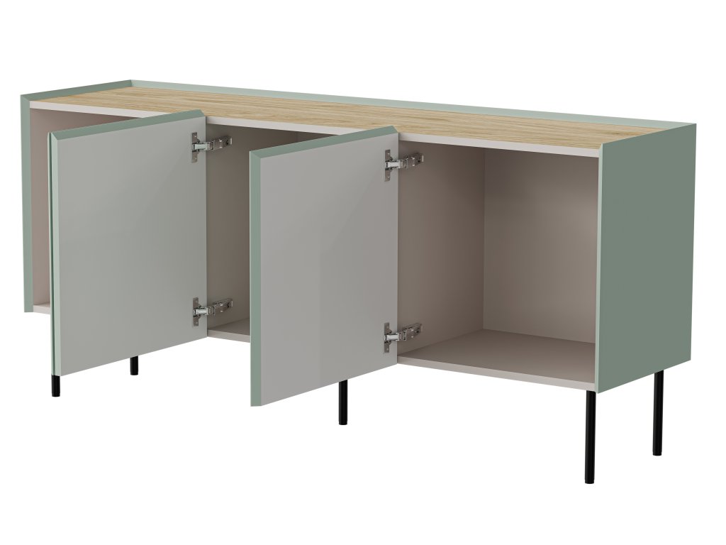 Stylová komoda Fellini 150 v olivově zelené barvě spojuje moderní design s praktickým úložným prostorem. Matně lakované povrchy, zapuštěná vrchní deska a šikmé hrany dodávají nábytku jemnost a lehkost. Kovové nožičky a bezúchytová dvířka podtrhují elegantní charakter celé kolekce Fellini.
