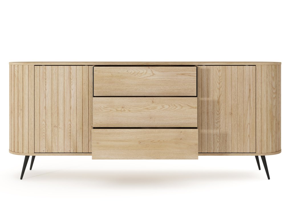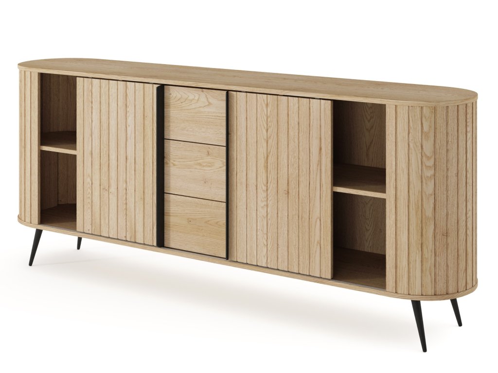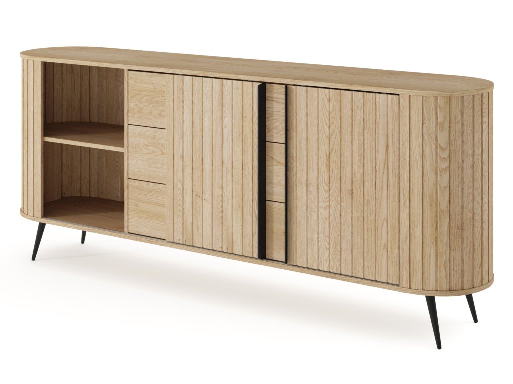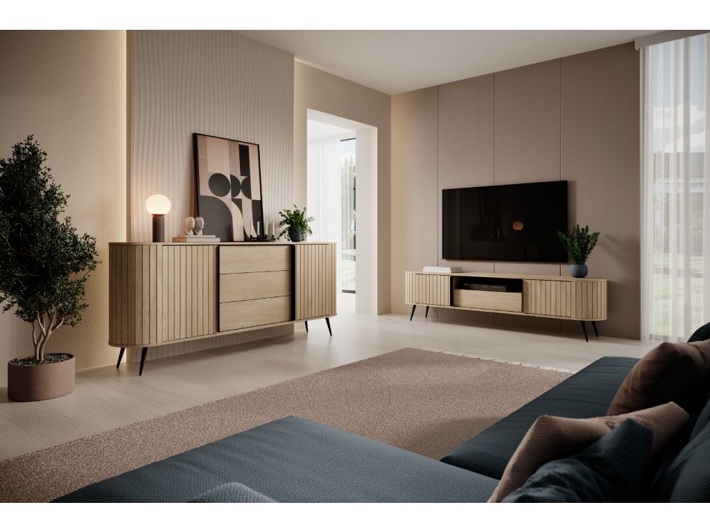 Komoda Lovi A v dubovém dekoru zaujme svými zaoblenými boky a rýhovanými čely, které vnášejí do prostoru moderní charakter. Posuvná dvířka a zásuvky s push-to-open systémem působí minimalisticky a elegantně. Kovové černé detaily dodávají jemný kontrast a vizuální stabilitu. Praktické řešení pro stylovou a přehlednou domácnost.