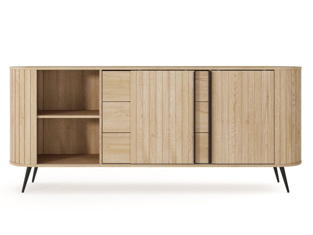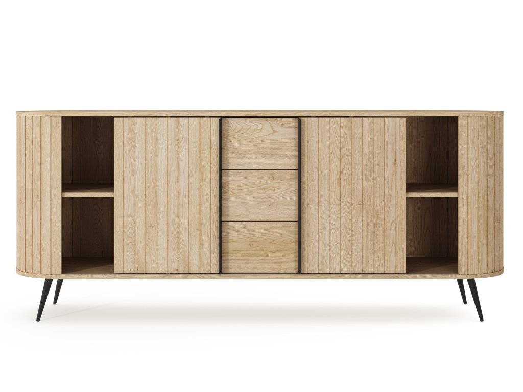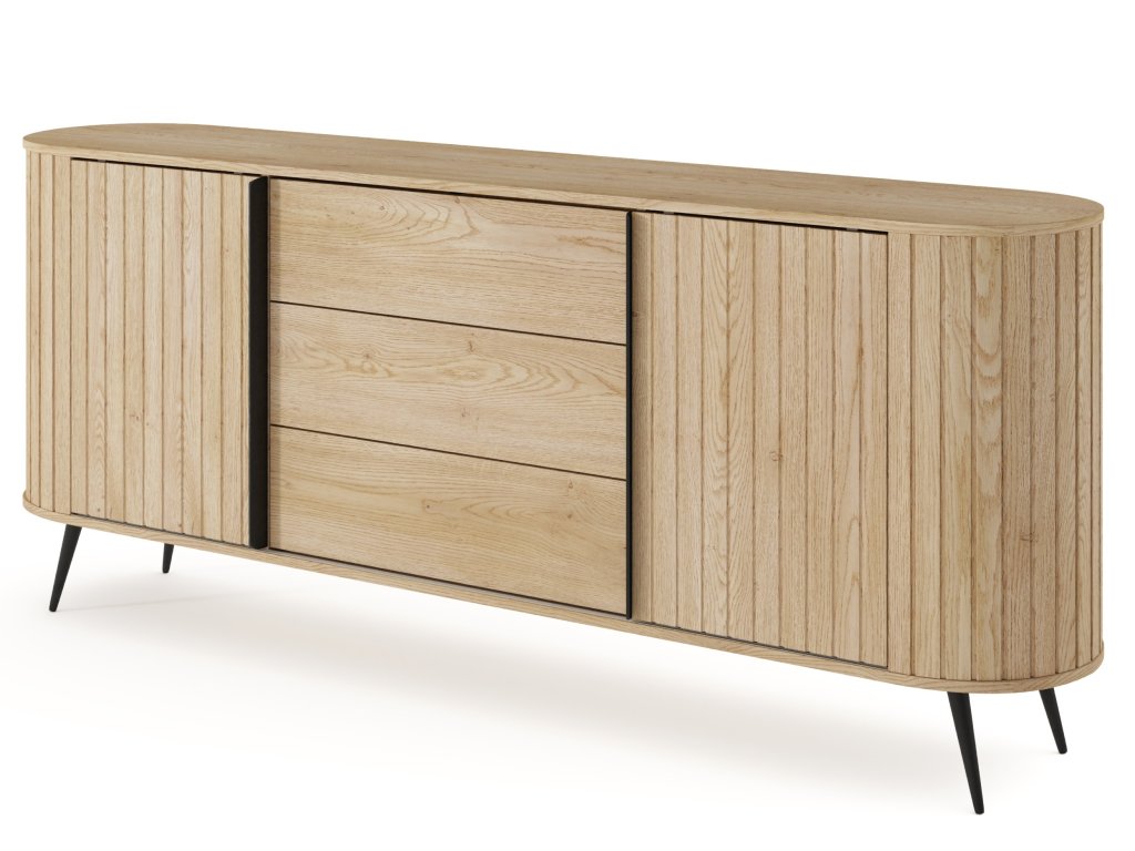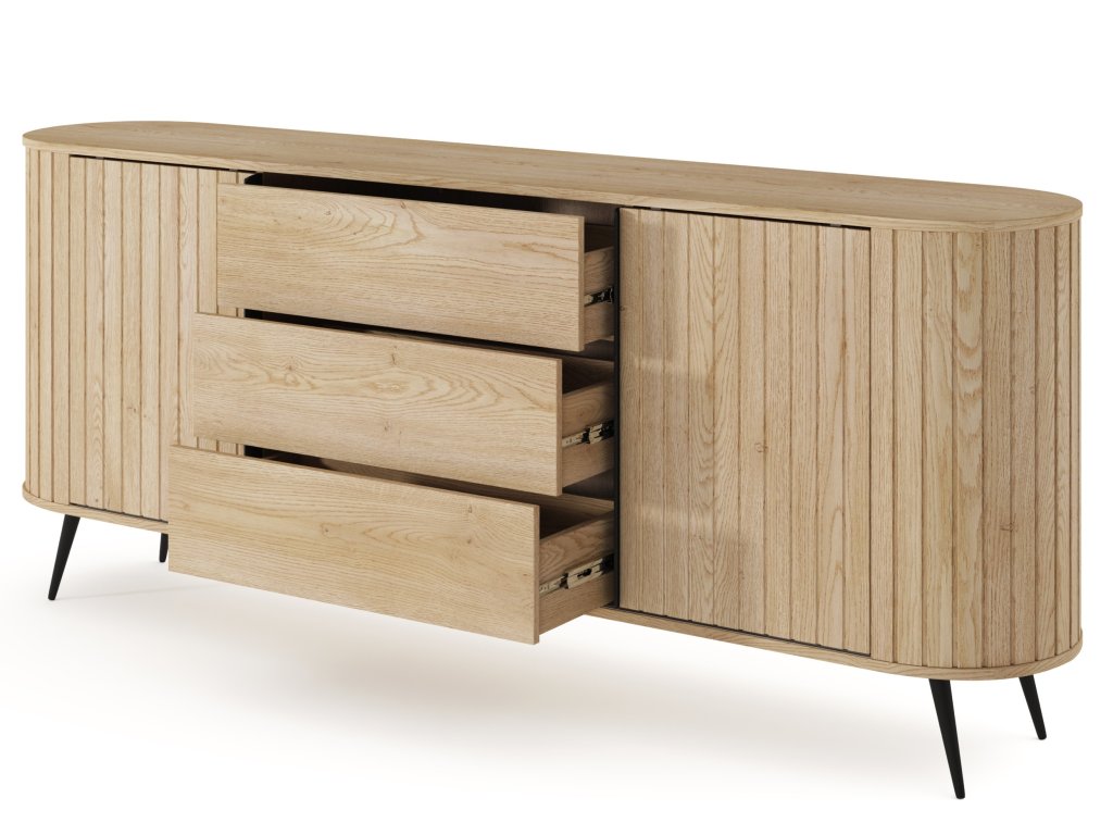 Komoda Lovi A v dubovém dekoru zaujme svými zaoblenými boky a rýhovanými čely, které vnášejí do prostoru moderní charakter. Posuvná dvířka a zásuvky s push-to-open systémem působí minimalisticky a elegantně. Kovové černé detaily dodávají jemný kontrast a vizuální stabilitu. Praktické řešení pro stylovou a přehlednou domácnost.