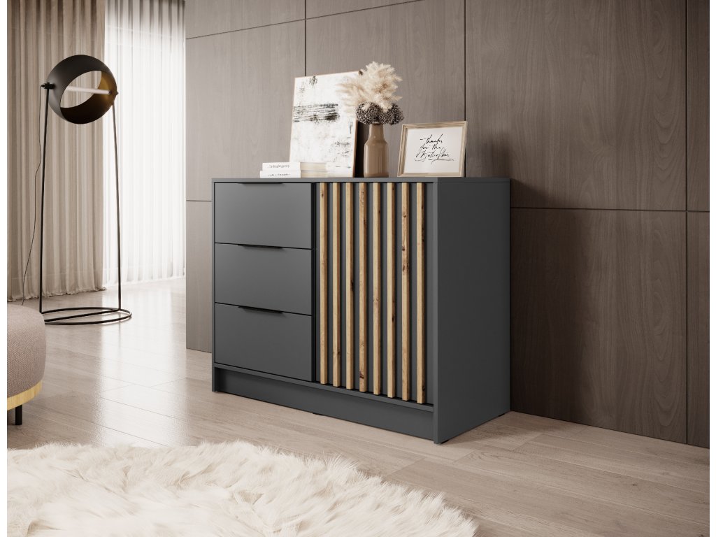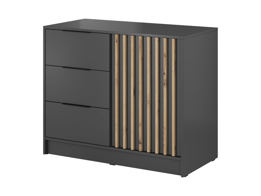 Komoda Nelly K2 ve stylové kombinaci grafitové barvy s ozdobnými lamelami v dekoru dub artisan je ideální volbou pro ty, kteří hledají praktický úložný prostor v elegantním a kontrastním provedení. Vnitřní uspořádání zahrnuje tři zásuvky umístěné na jedné straně (standardně vpravo) a jedny dvířka s policí na straně druhé, což zaručuje univerzální využití – od oblečení až po dokumenty či drobnosti. Lamely v dekoru dub artisan vytvářejí přirozený dřevěný akcent, zatímco grafitové plochy působí elegantně a moderně. Díky plnovýsuvným zásuvkám (nosnost 2 kg), kvalitním ABS hranám a černým plastovým úchytům je nábytek nejen vizuálně atraktivní, ale také odolný a funkční.
