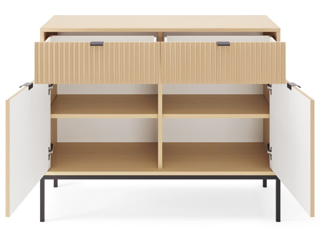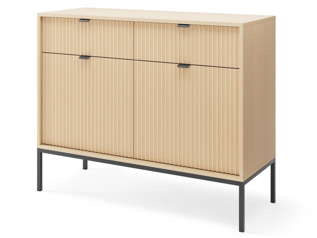 Komoda Novas v moderním designu vnese do interiéru luxusní nádech. Je vyrobena z kvalitních materiálů odolných vůči poškození. ABS hrany ji dělají odolnou vůči poškození. Přední drážkované části jsou doplněny o úchyty v černé barvě z hliníku. Komoda stojí na černé konstrukci, která mu dodává lehkost. Disponuje 2 zásuvkami a policemi za dvířky.