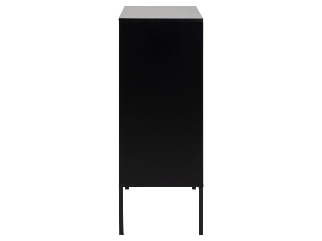 Pevná základna z černé oceli s hrubým práškovým nástřikem dodává komodě stabilitu a moderní industriální vzhled. Dvířka se otevírají pomocí funkce push-to-open, což ještě více podtrhuje čisté linie a minimalistické provedení.