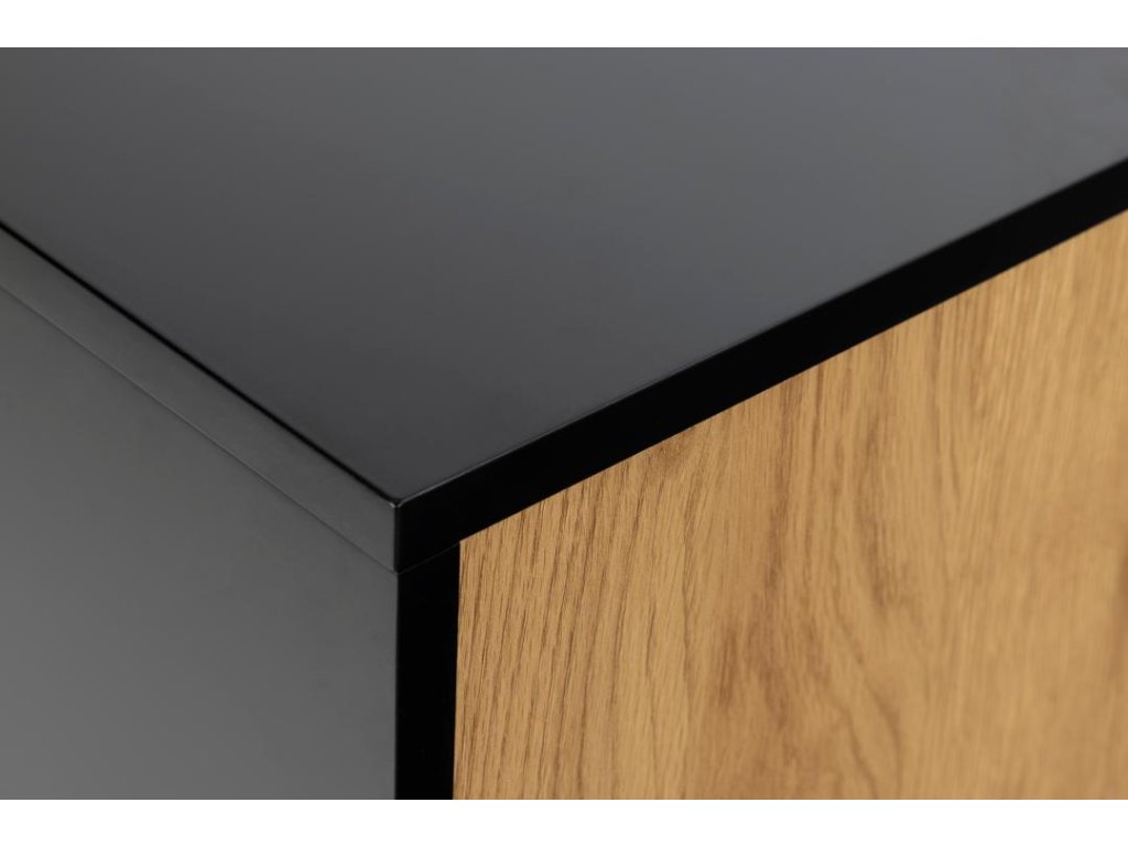 Uvnitř najdete 2 pevné police, každá s nosností až 15 kg, což nabízí dostatek úložného prostoru na nádobí, textilie, dokumenty či dekorace. Komoda je vyrobena ze snadno udržovatelných materiálů a díky výraznému kontrastu černé a dubu se stane dominantním prvkem každého moderního interiéru.