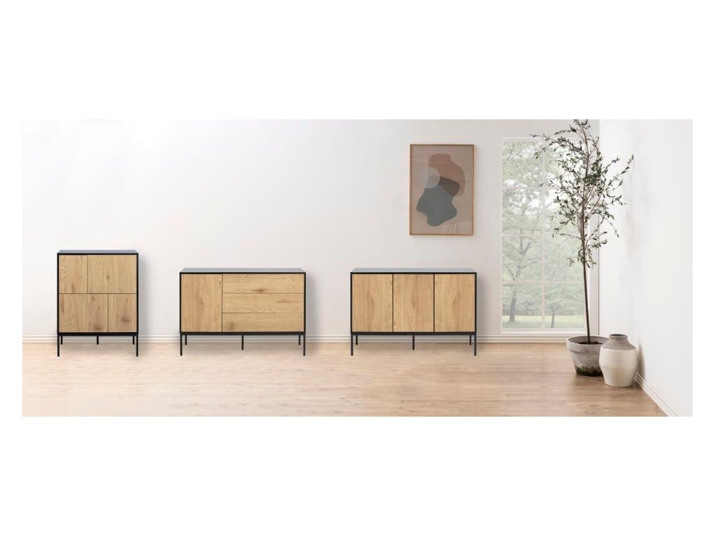 Komoda Seaford spojuje moderní průmyslový design s teplým přírodním výrazem divokého dubu. Vrchní deska a rám v černém PU lakování vytvářejí elegantní kontrast k 4 dvířkům v dekoru matného divokého dubu, které dodávají komodě přirozenou texturu a příjemný charakter.